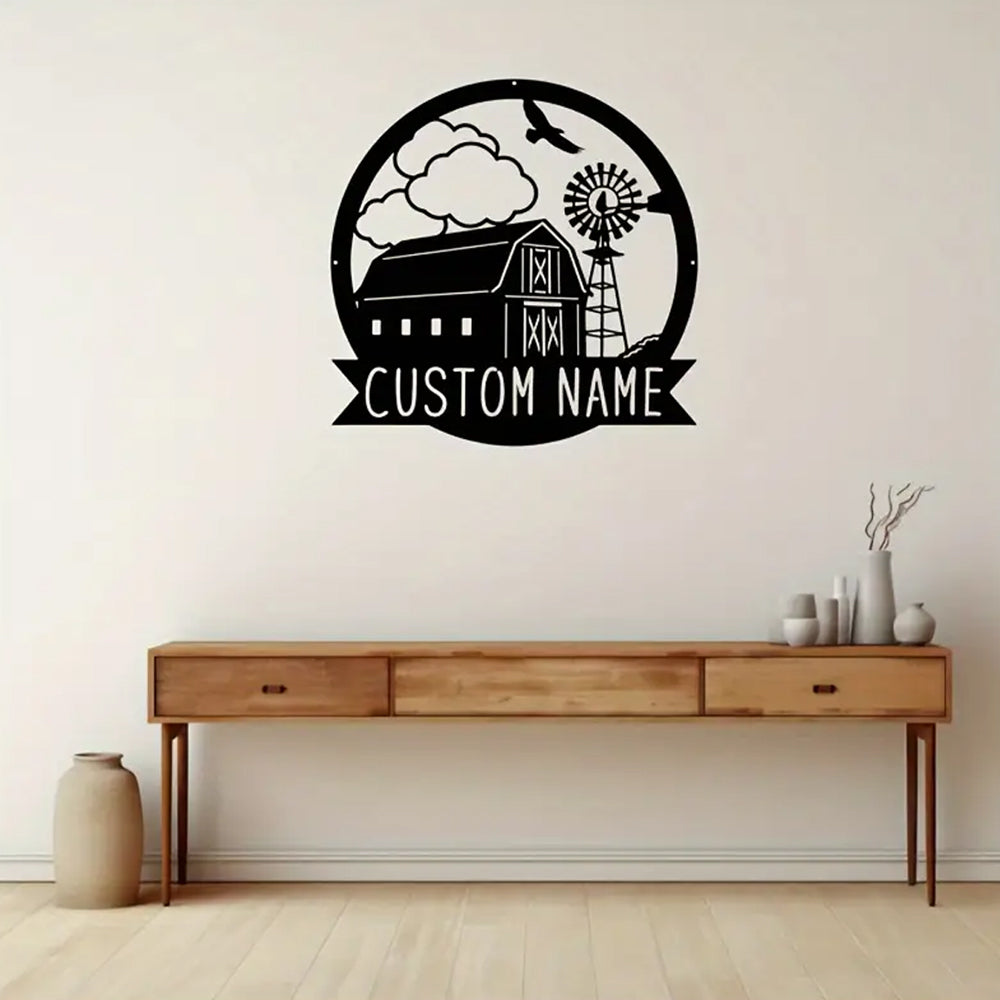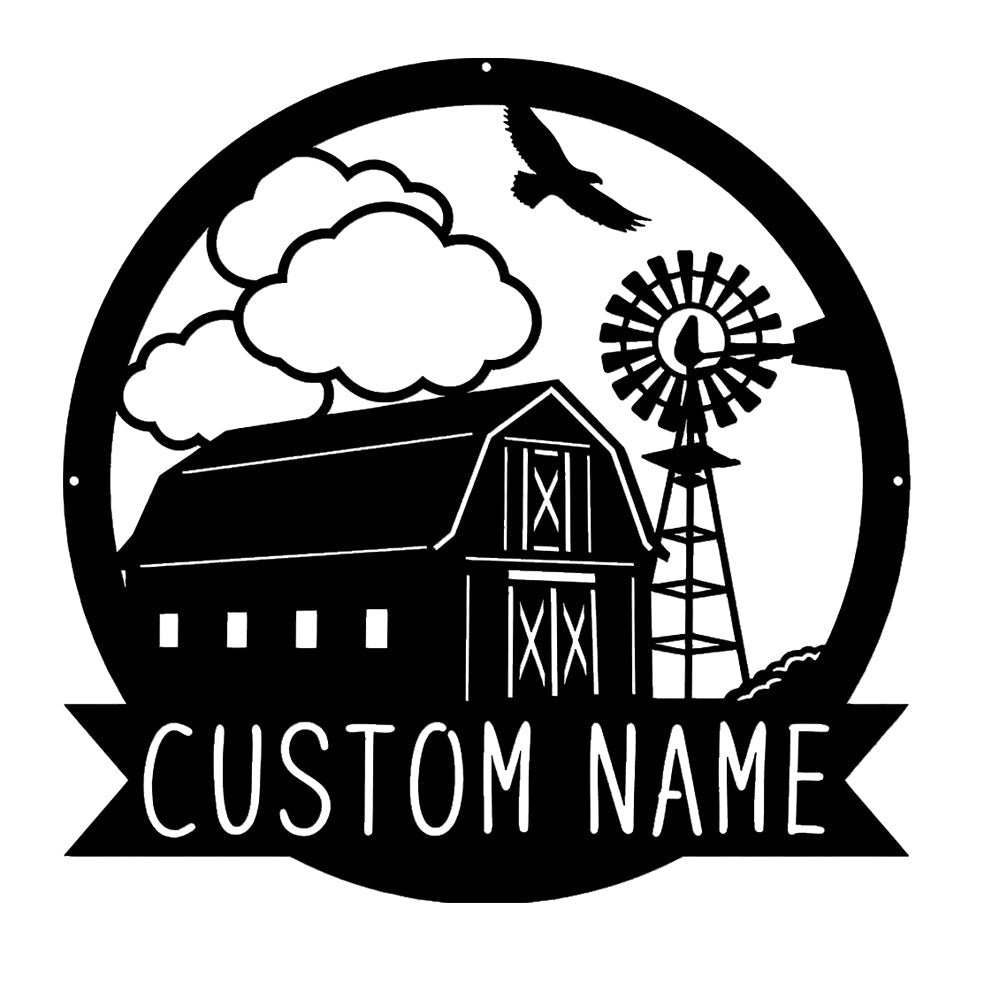 Customizable Round Rustic Sign with Barn and Windmill Metal Wall Art Decoration