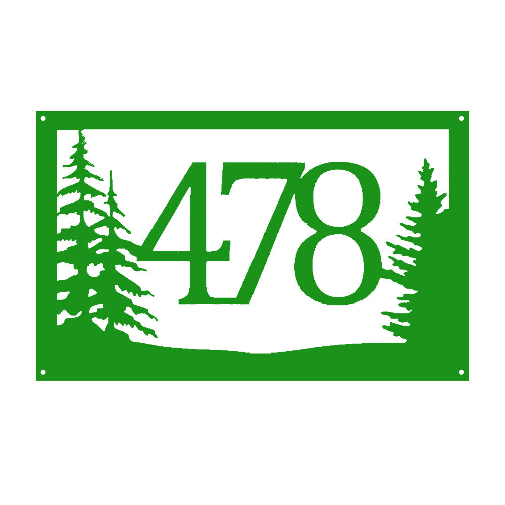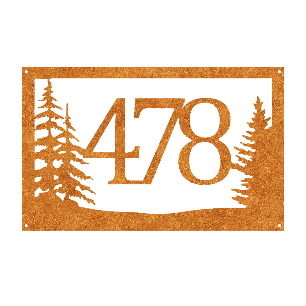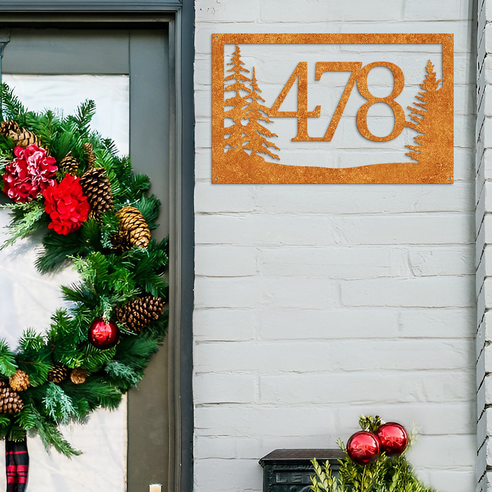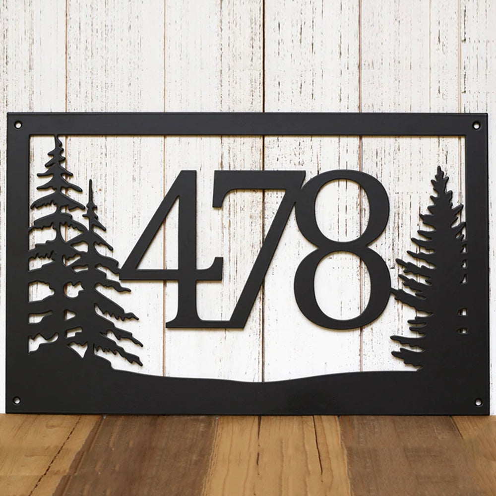 Rustic Metal House Number Sign With Pine Trees Matte Black Shown