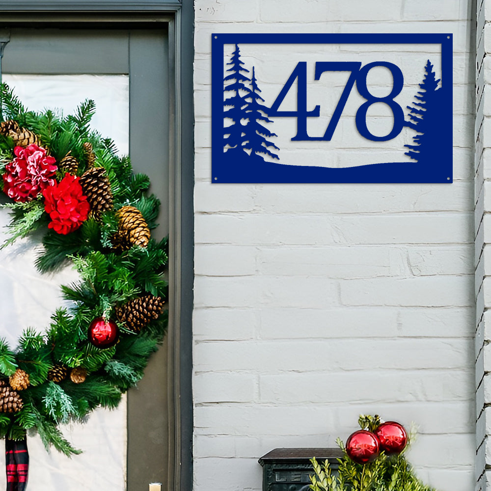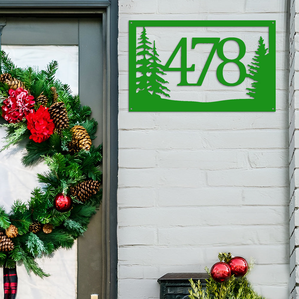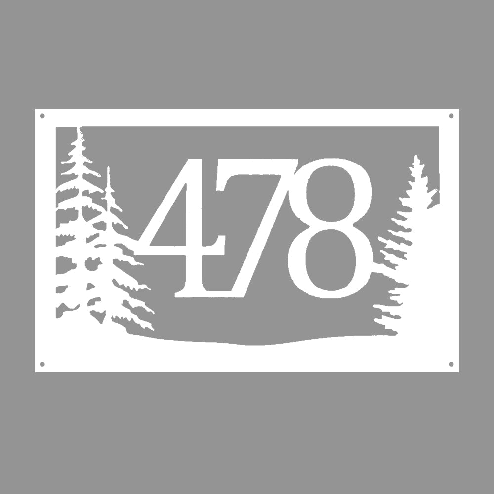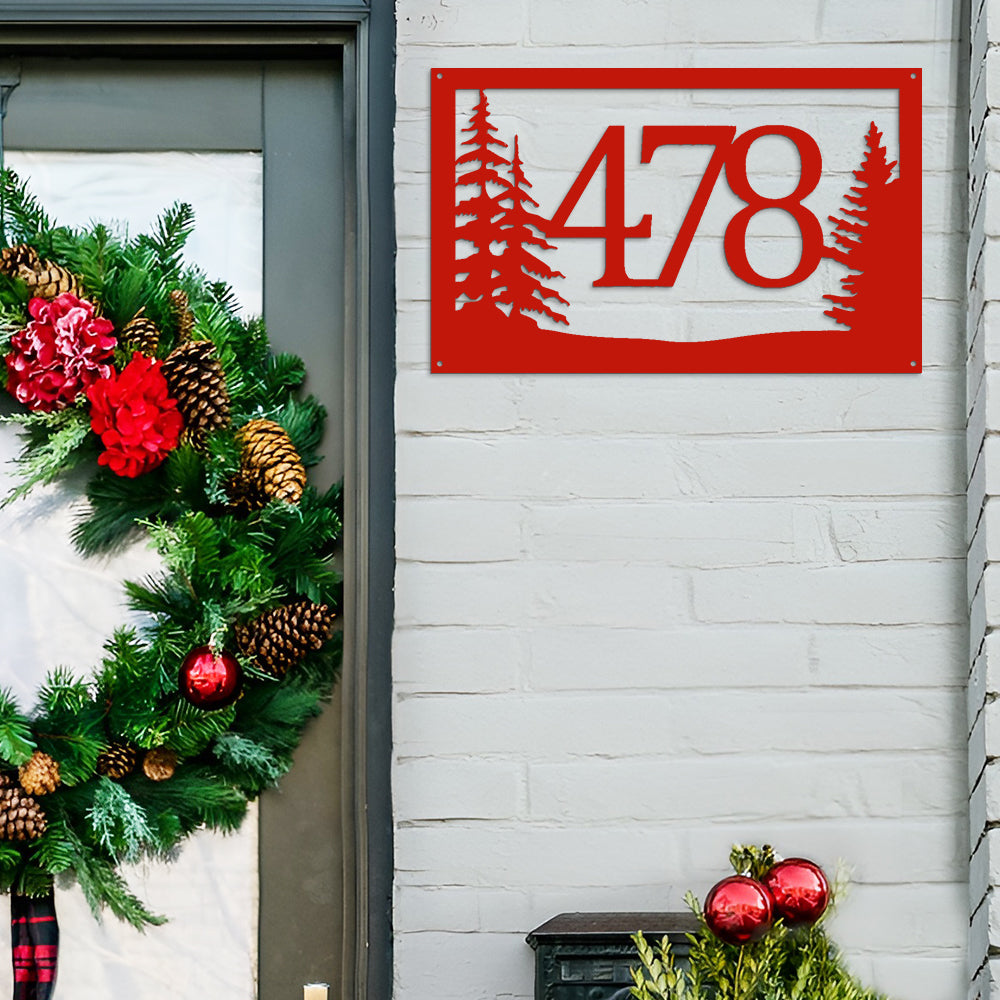 Rustic Metal House Number Sign With Pine Trees Matte Black Shown