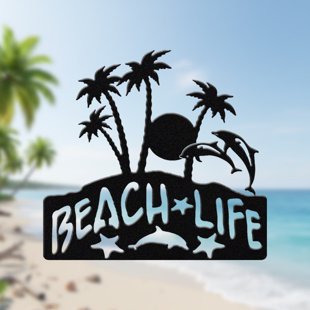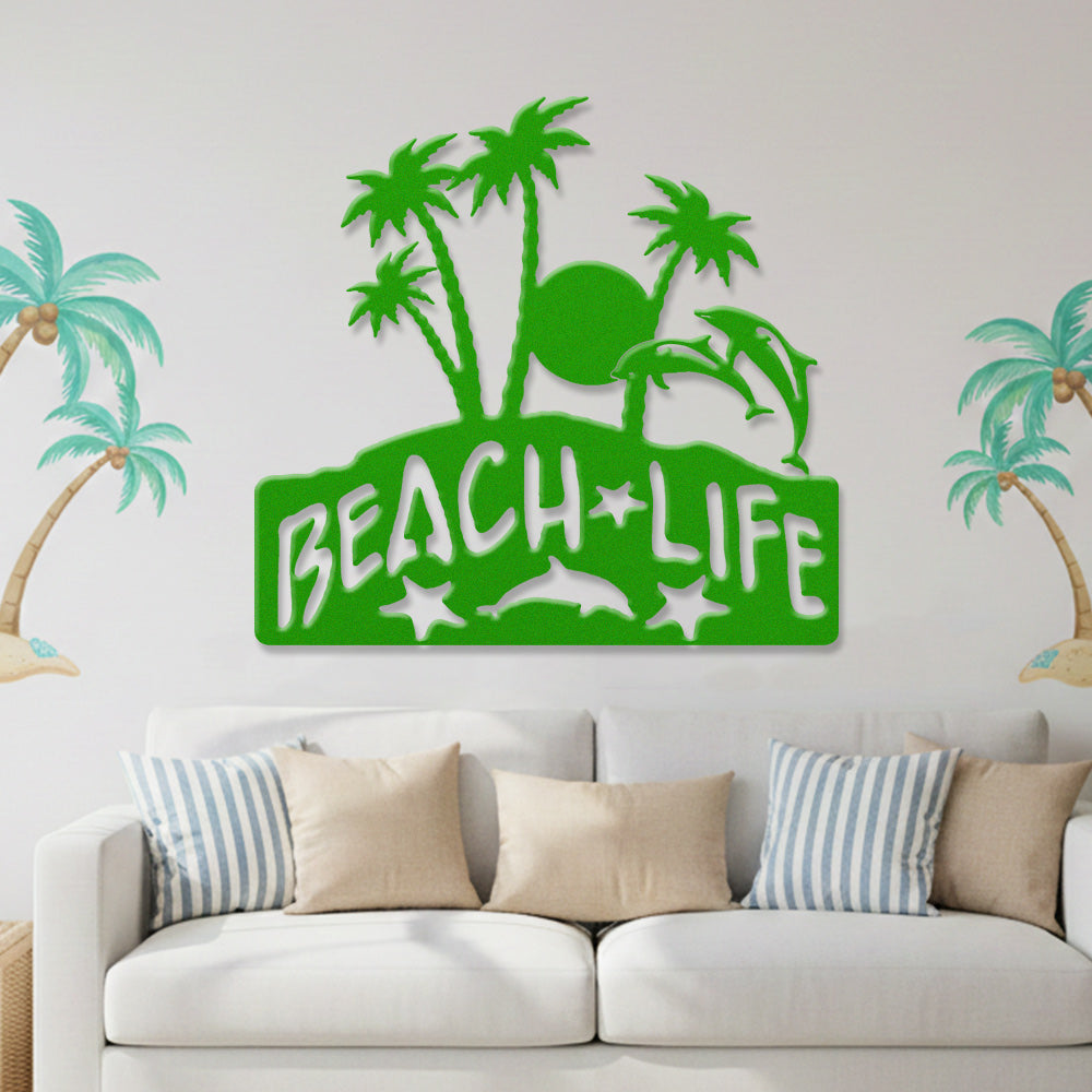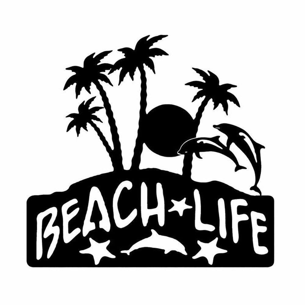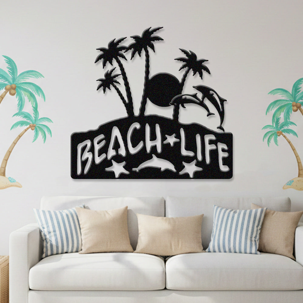 Beach Life Metal Wall Art – Tropical Palm & Dolphin Iron Metal Decor Sign