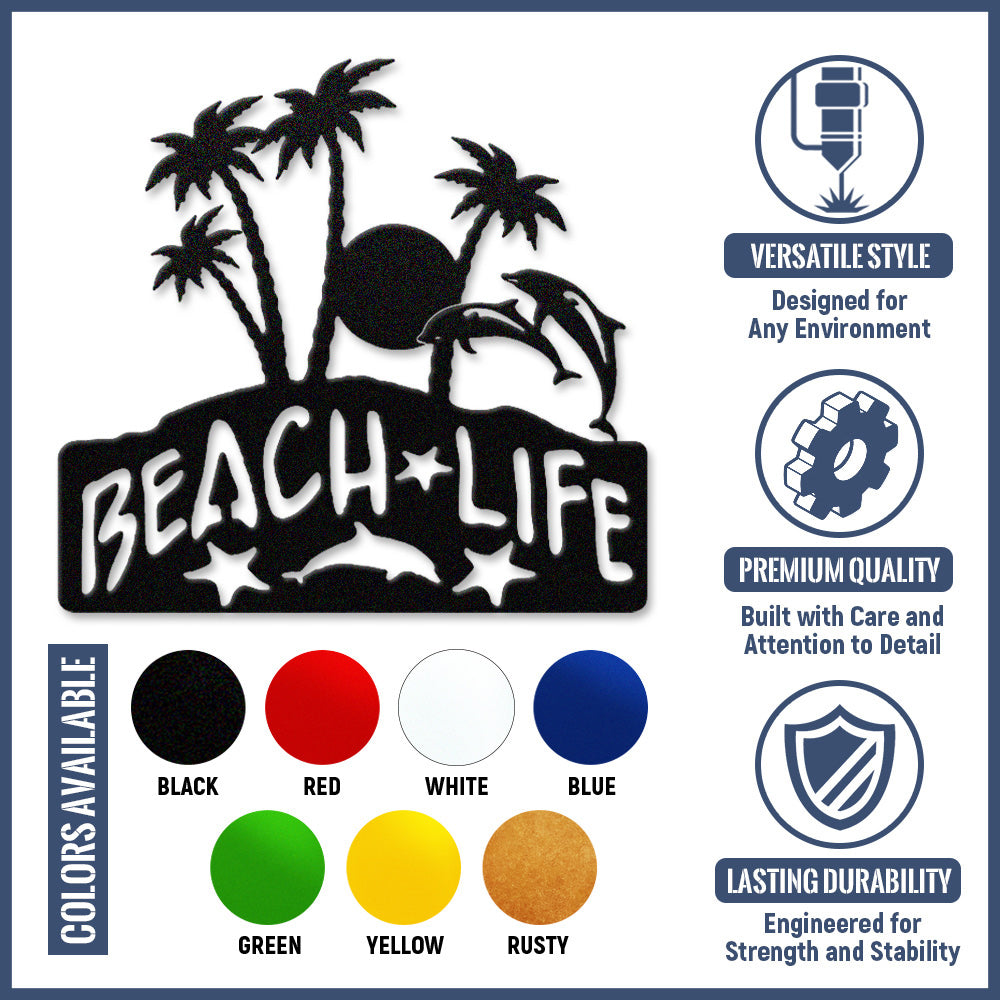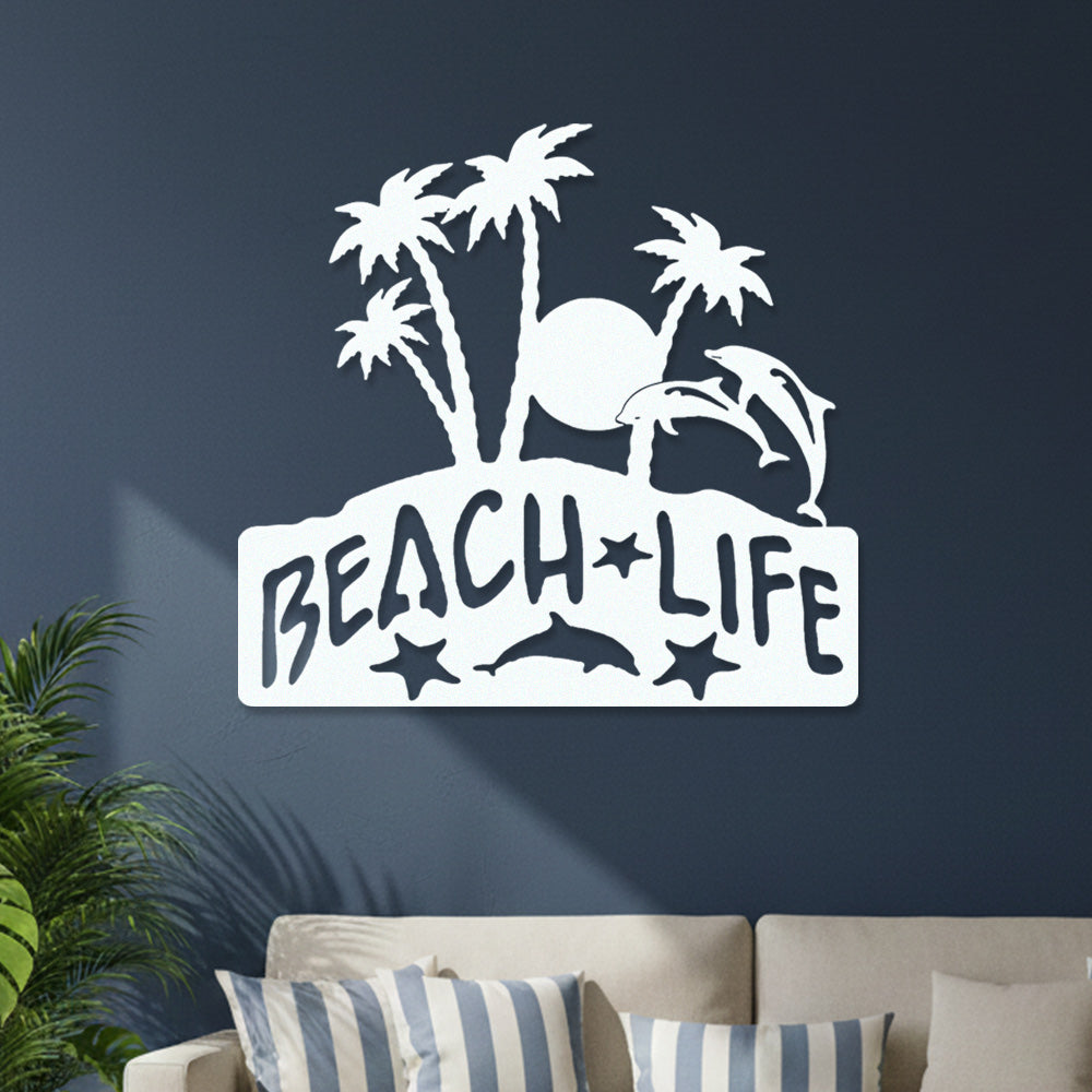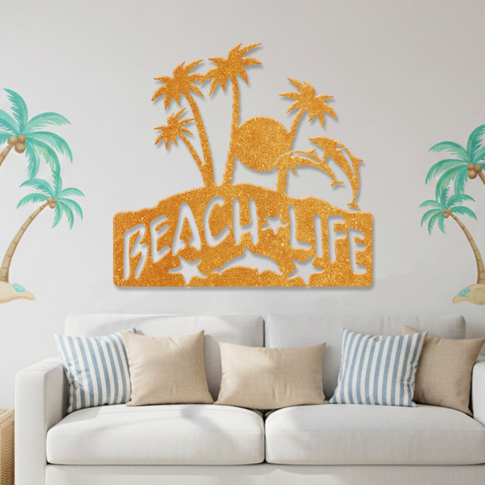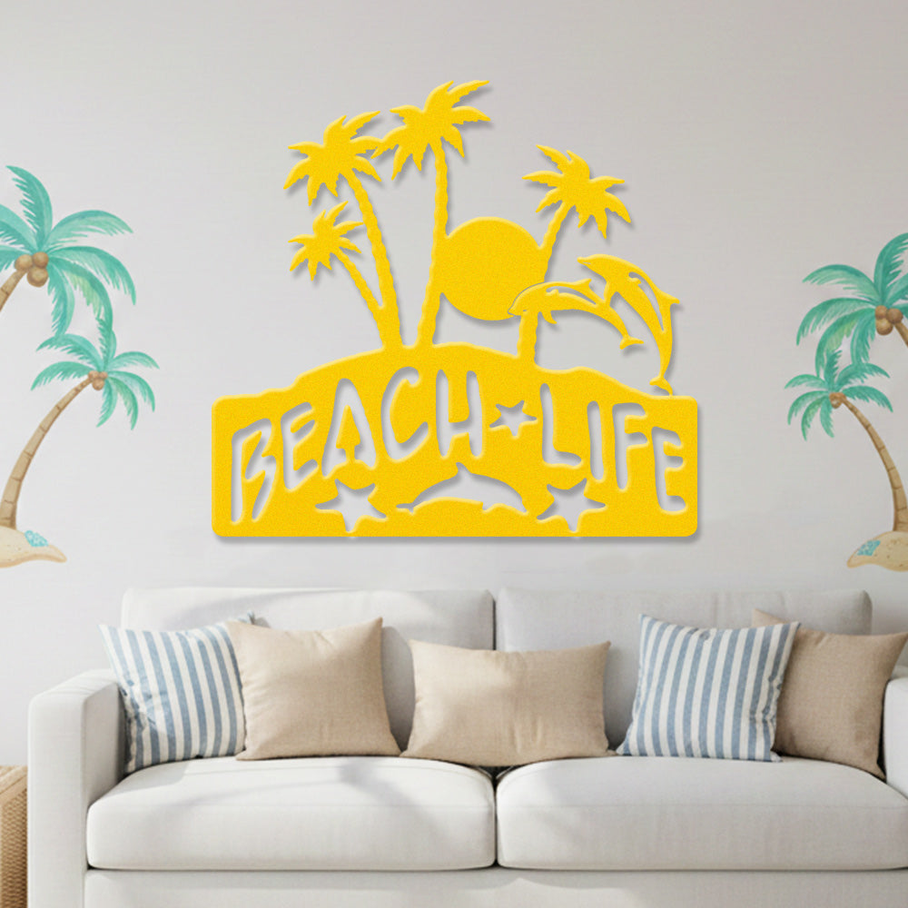 Beach Life Metal Wall Art – Tropical Palm & Dolphin Iron Metal Decor Sign