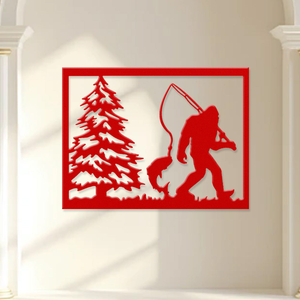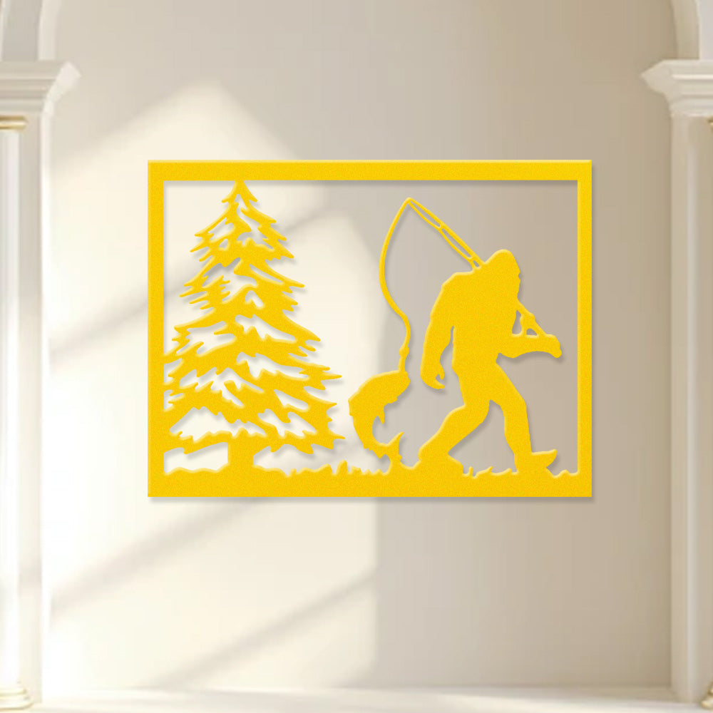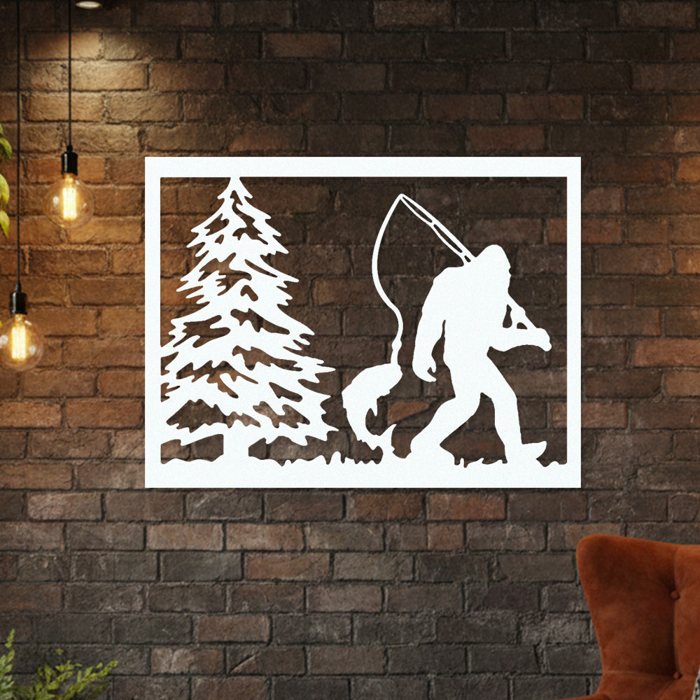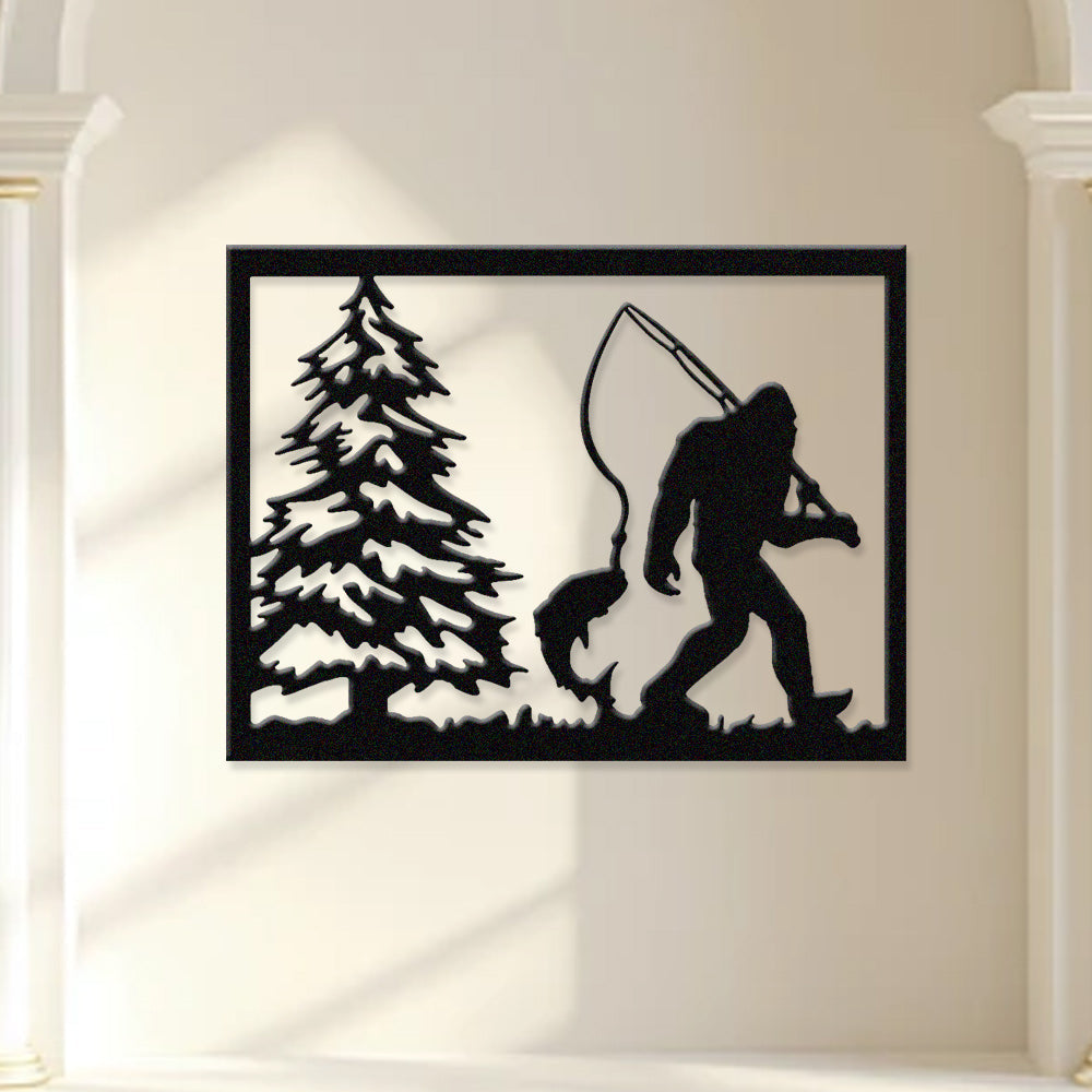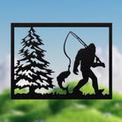 Bigfoot Fishing Scene Metal Wall Art – Sasquatch Outdoor Cabin Wall Decor