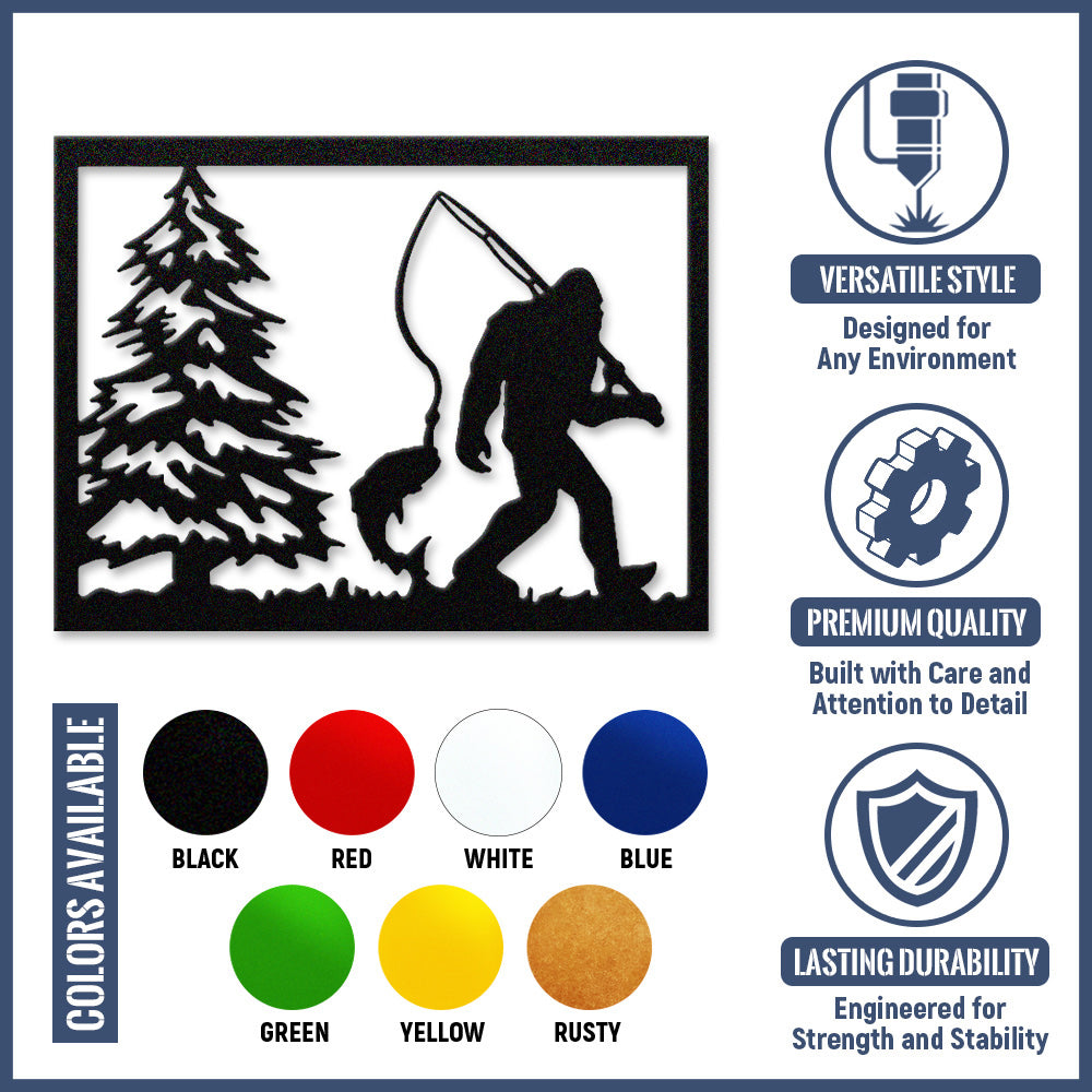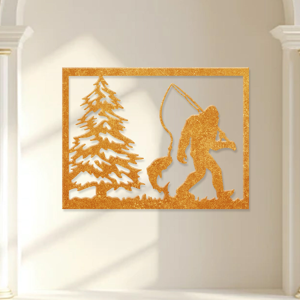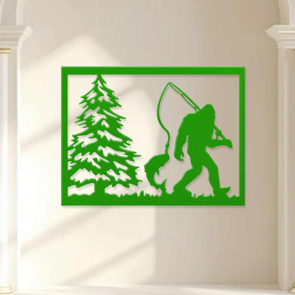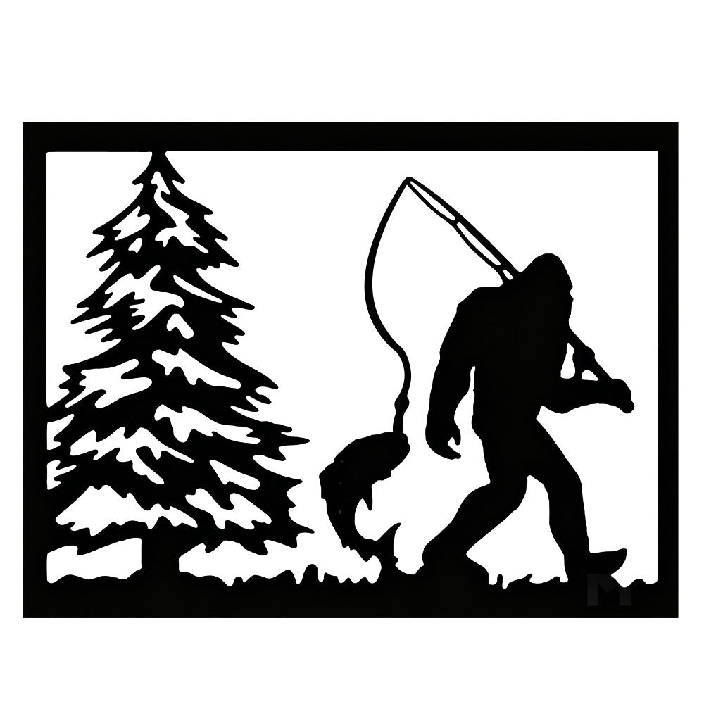 Bigfoot Fishing Scene Metal Wall Art – Sasquatch Outdoor Cabin Wall Decor