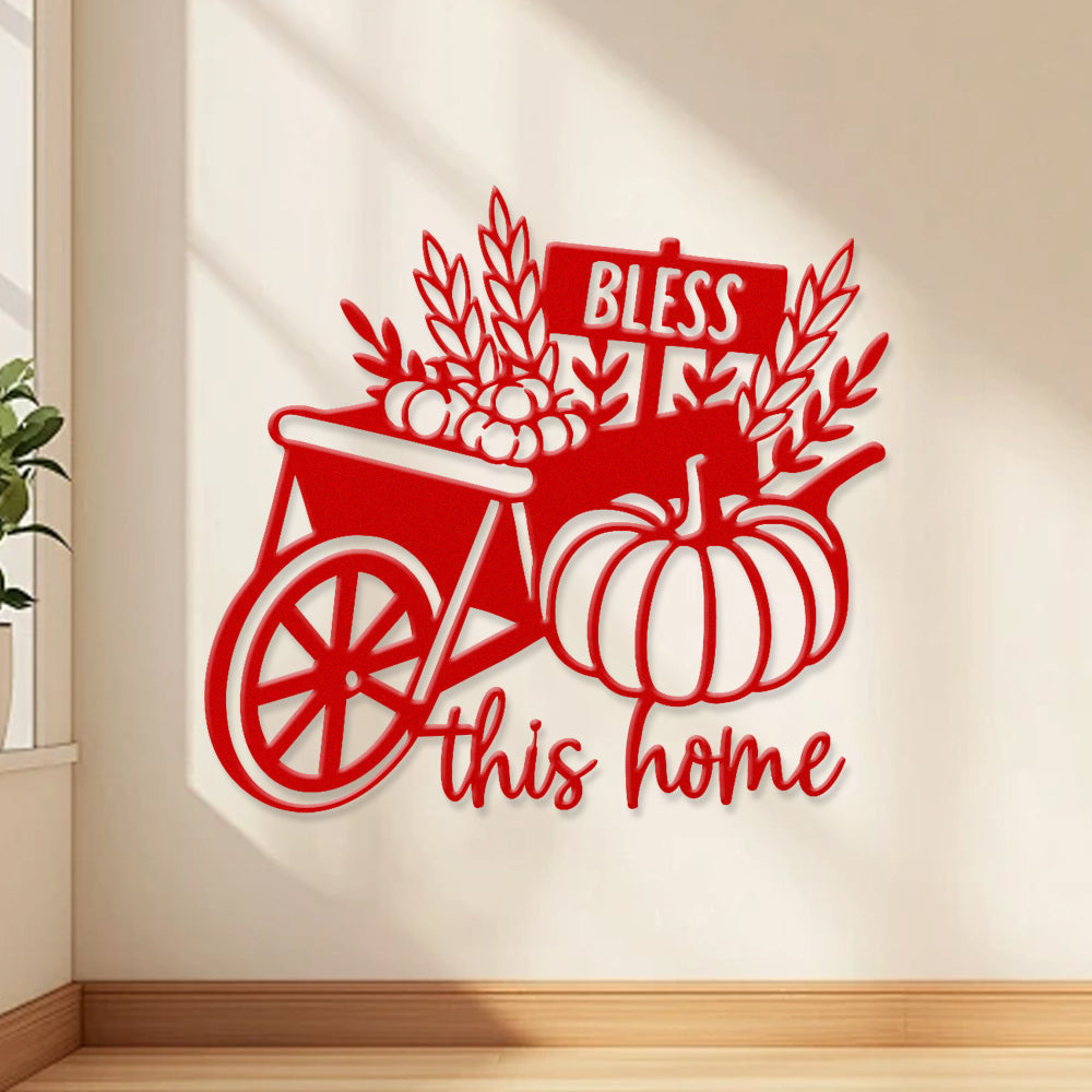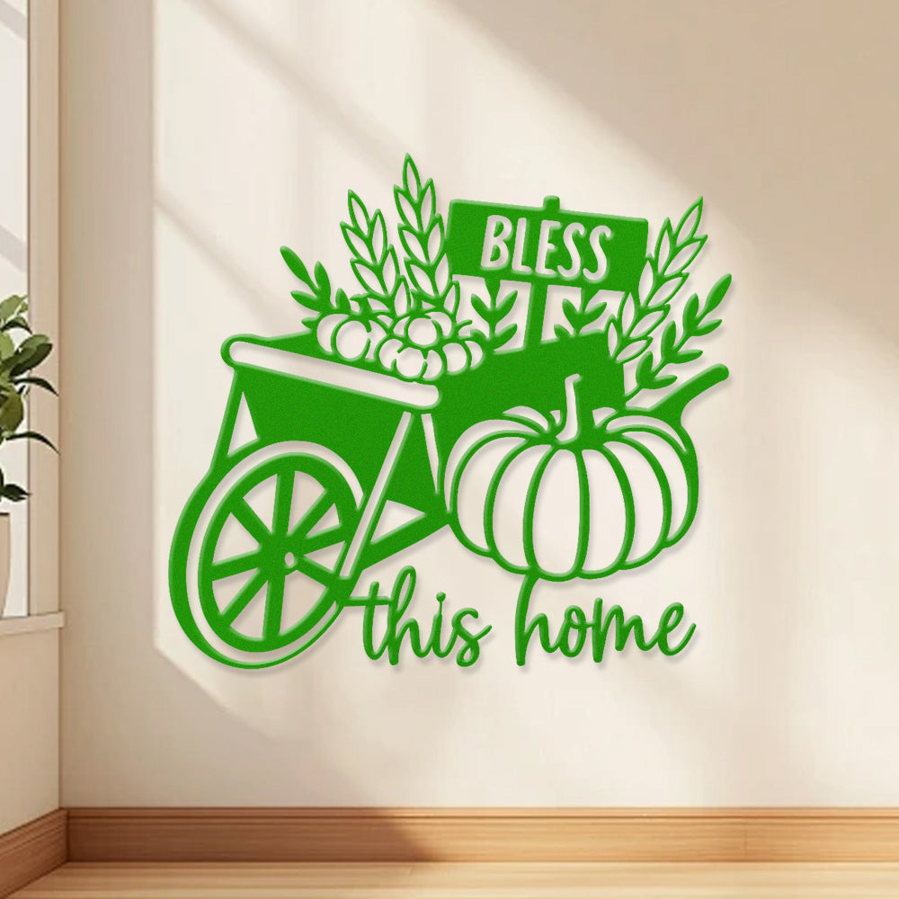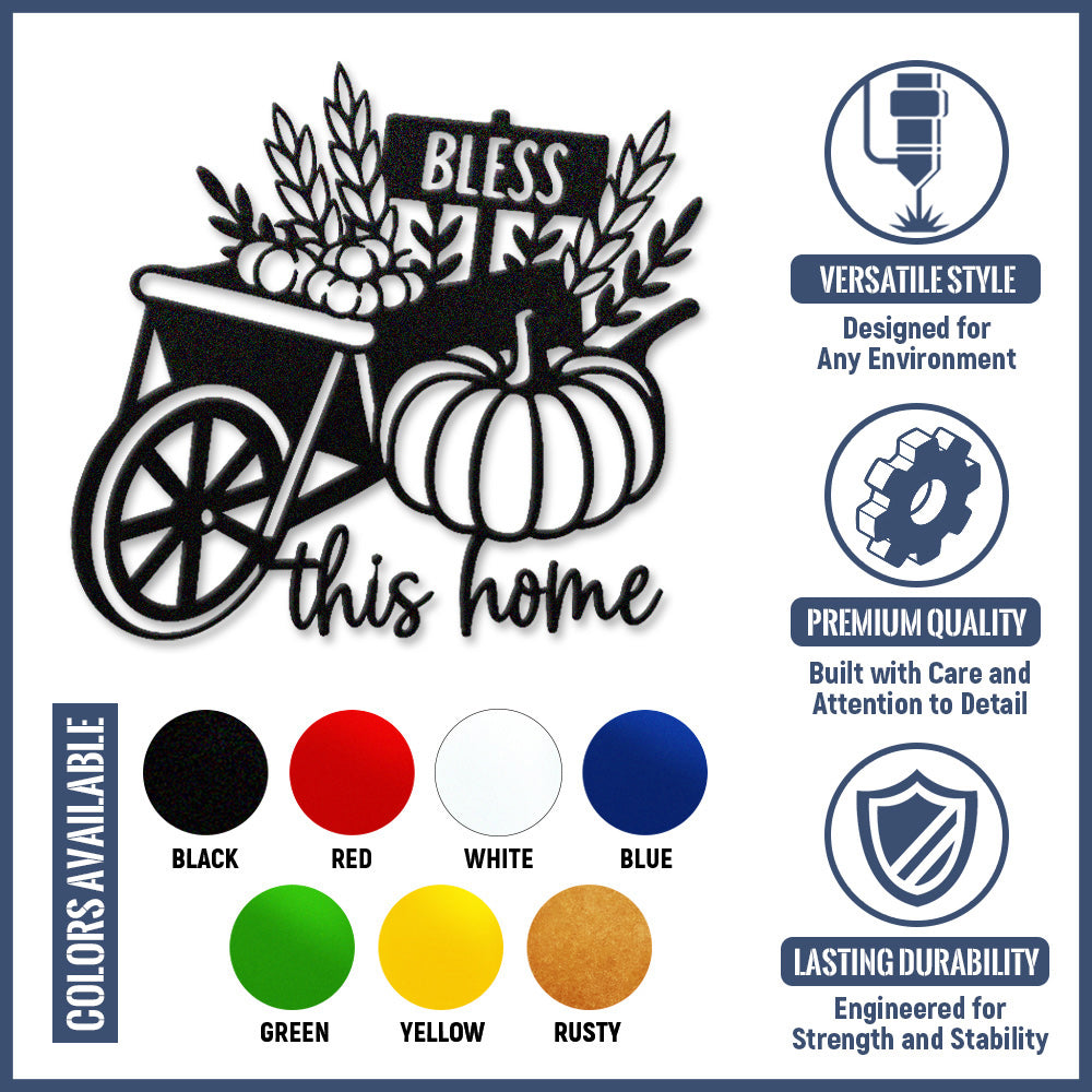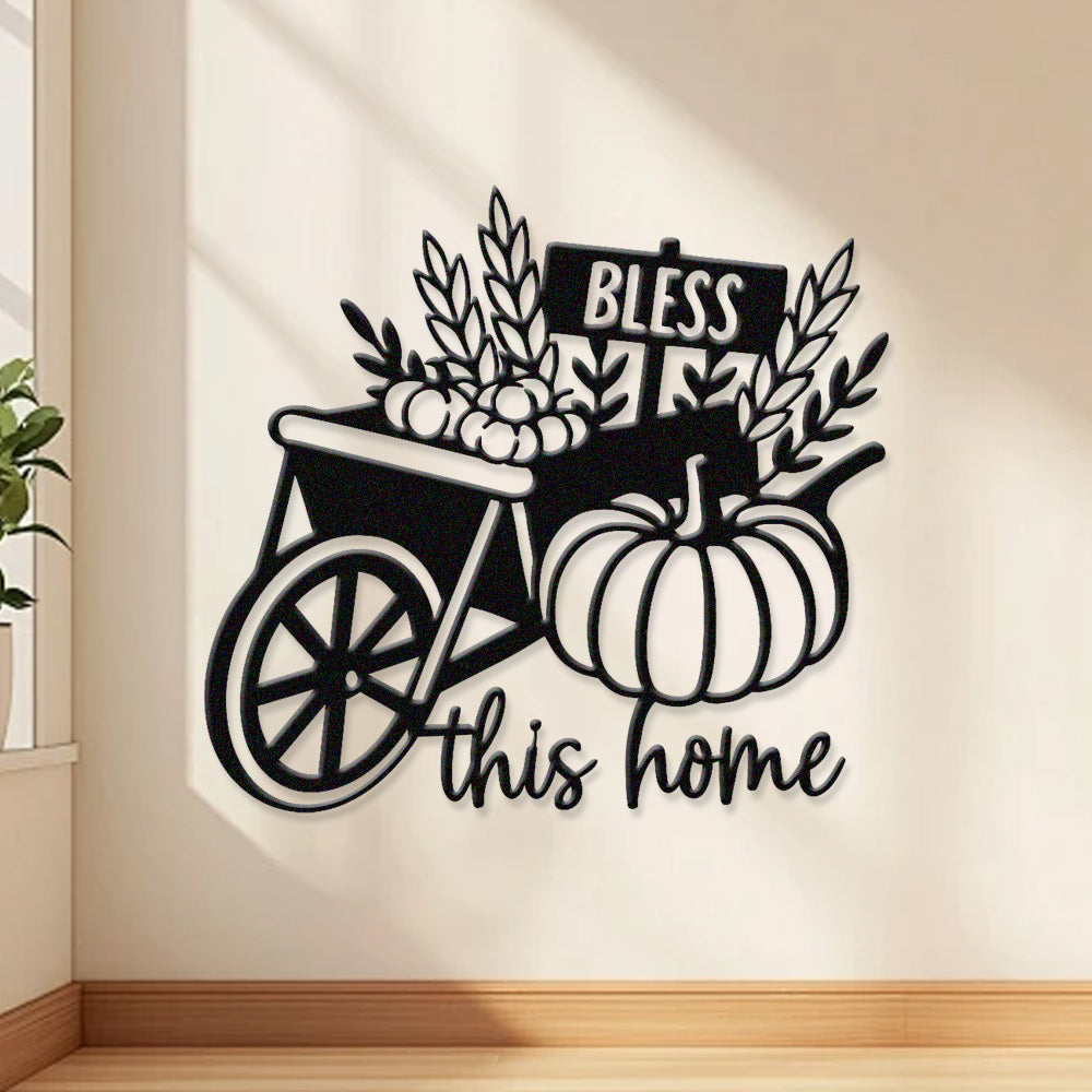 Bless This Home Metal Wall Art - Iron Pumpkin and Wheelbarrow Decor