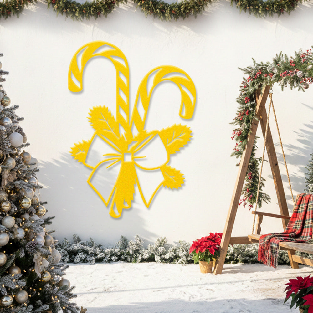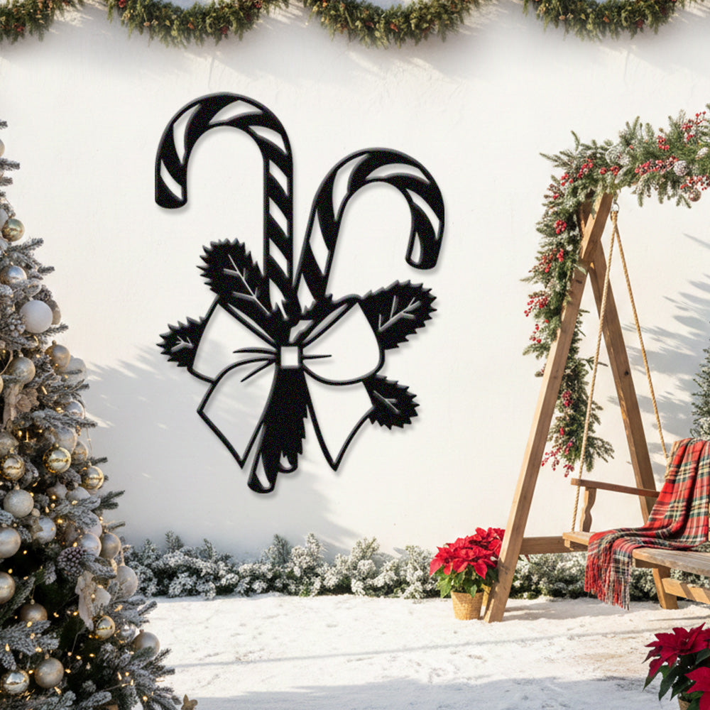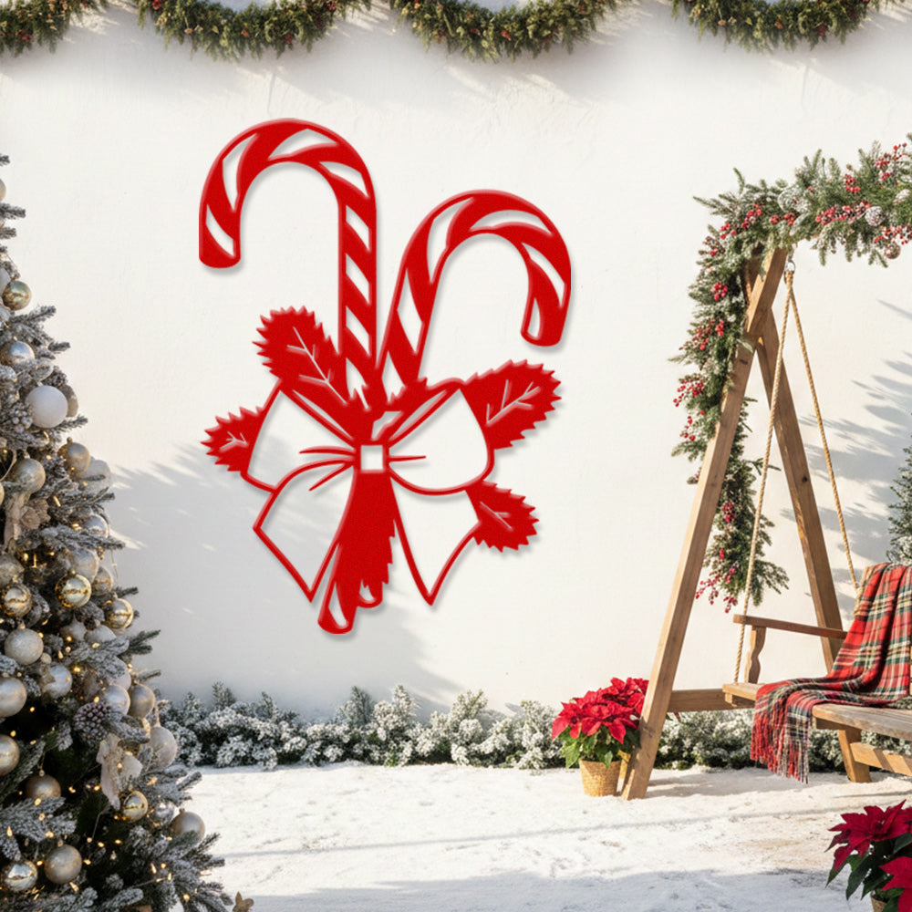Christmas Candy Cane Metal Wall Art – Festive Bow & Pine Holiday Metal Decor Sign