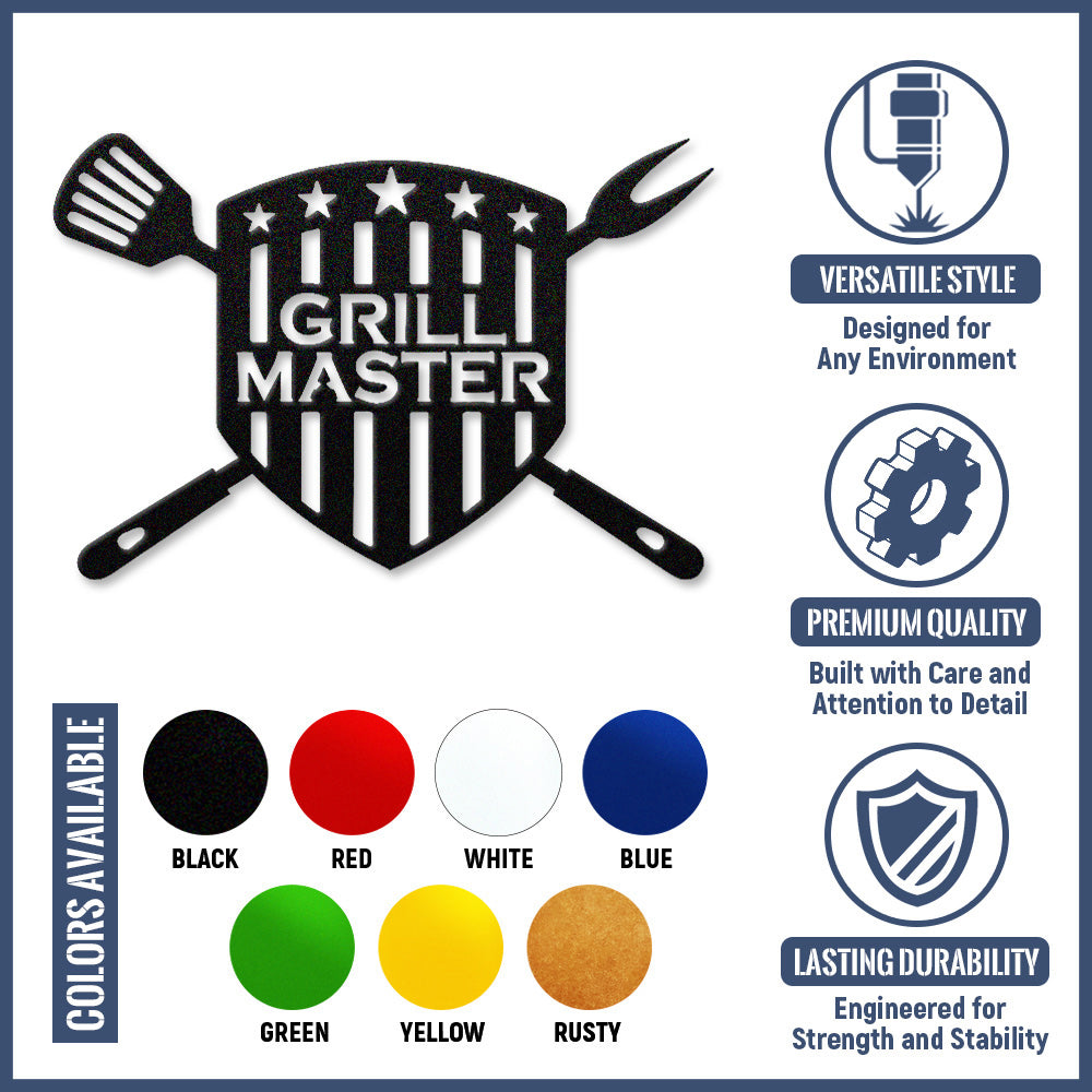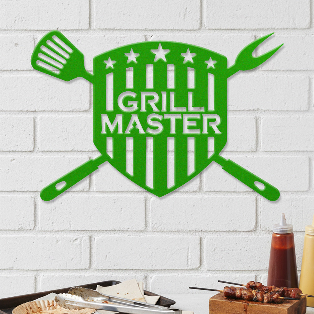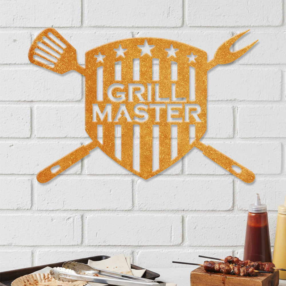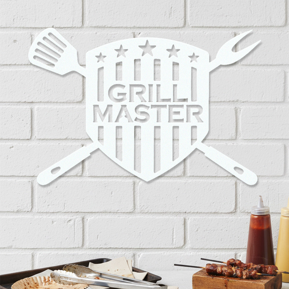 GRILL MASTER Metal Wall Art - Iron BBQ Shield Decor with Grill Tools