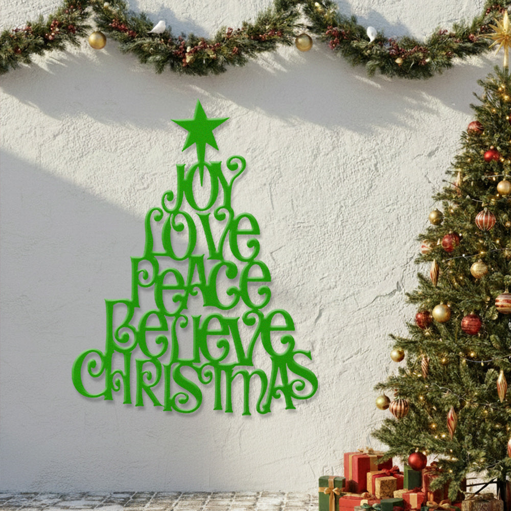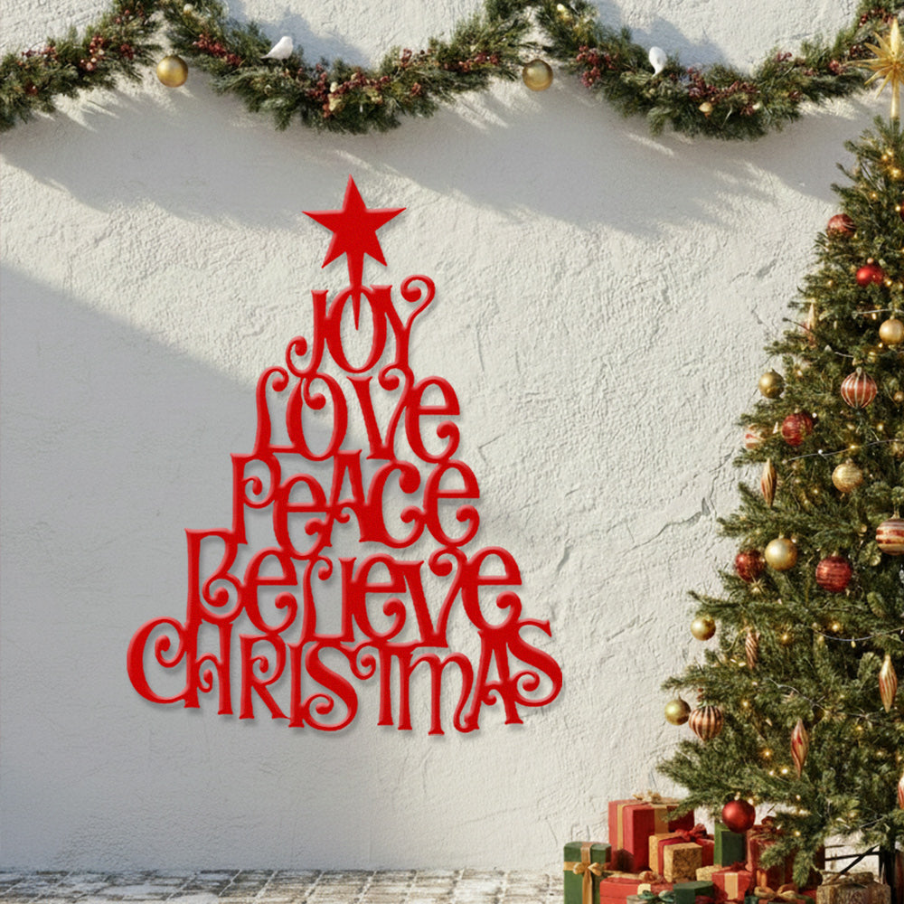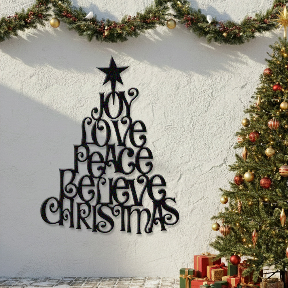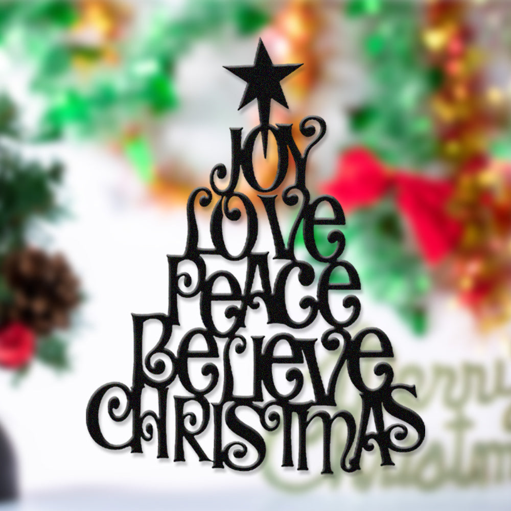 Joy Love Peace Believe Christmas Metal Wall Art – Tree Shape Holiday Metal Decor