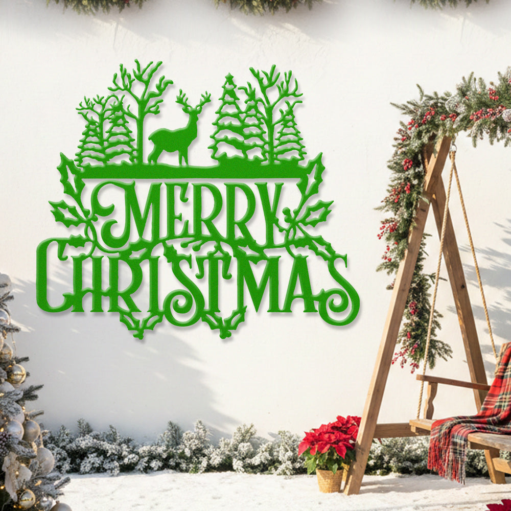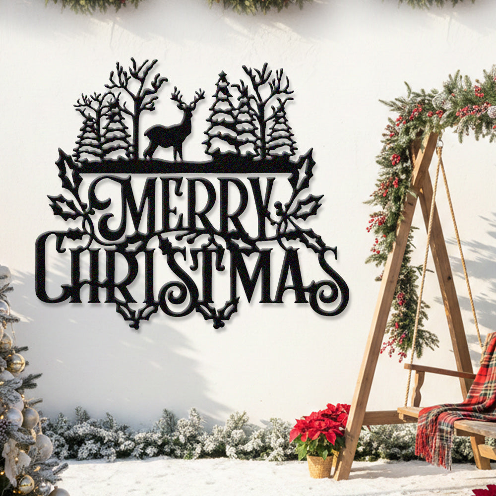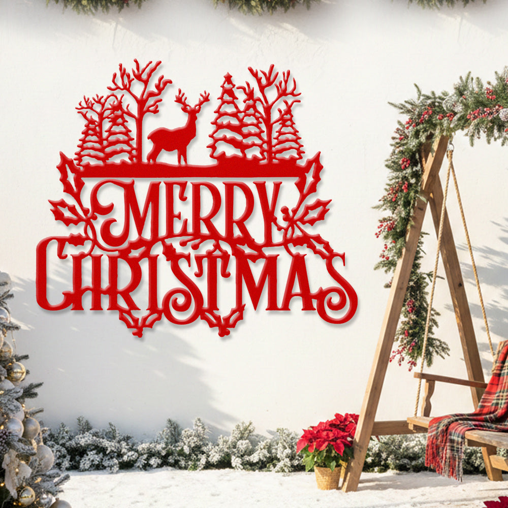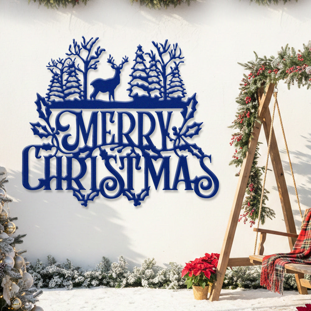 Merry Christmas Deer Forest Metal Wall Art – Rustic Holiday Metal Decor Sign