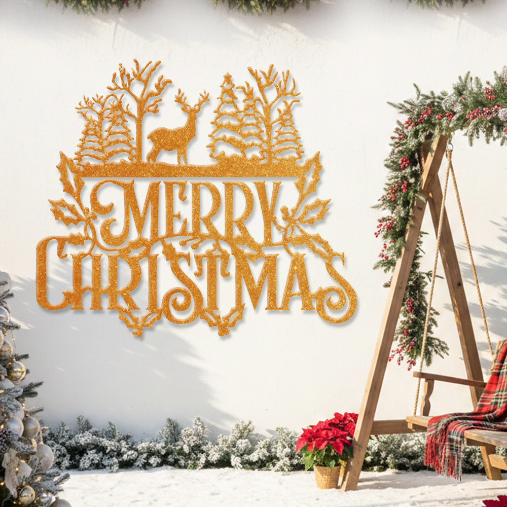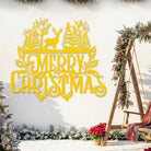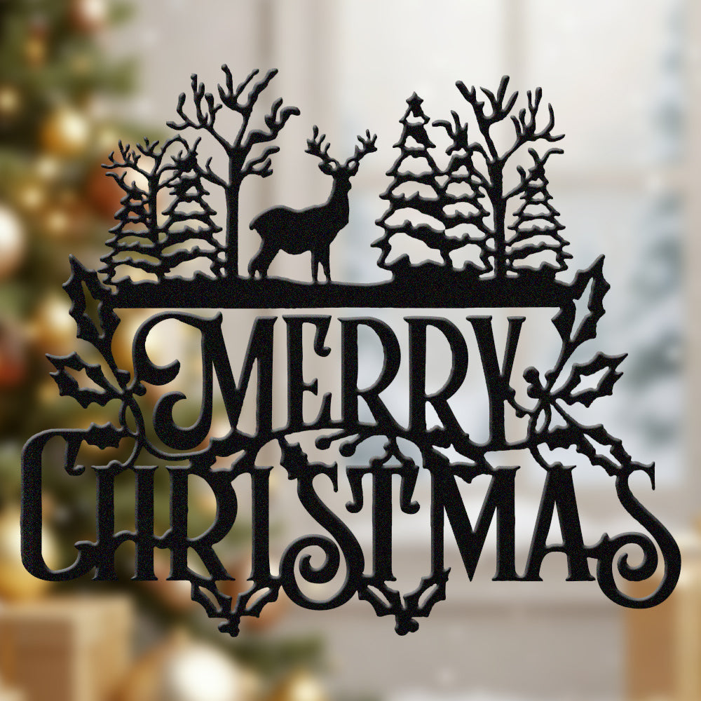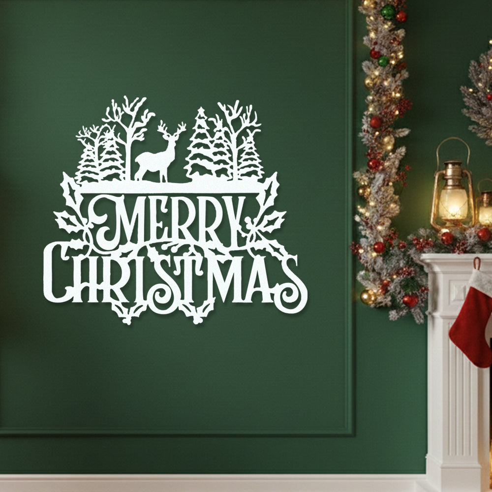 Merry Christmas Deer Forest Metal Wall Art – Rustic Holiday Metal Decor Sign