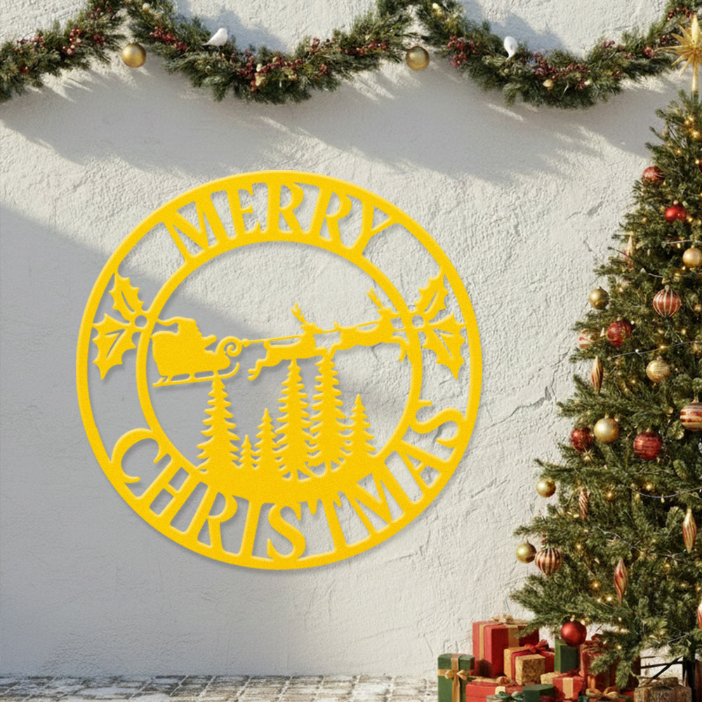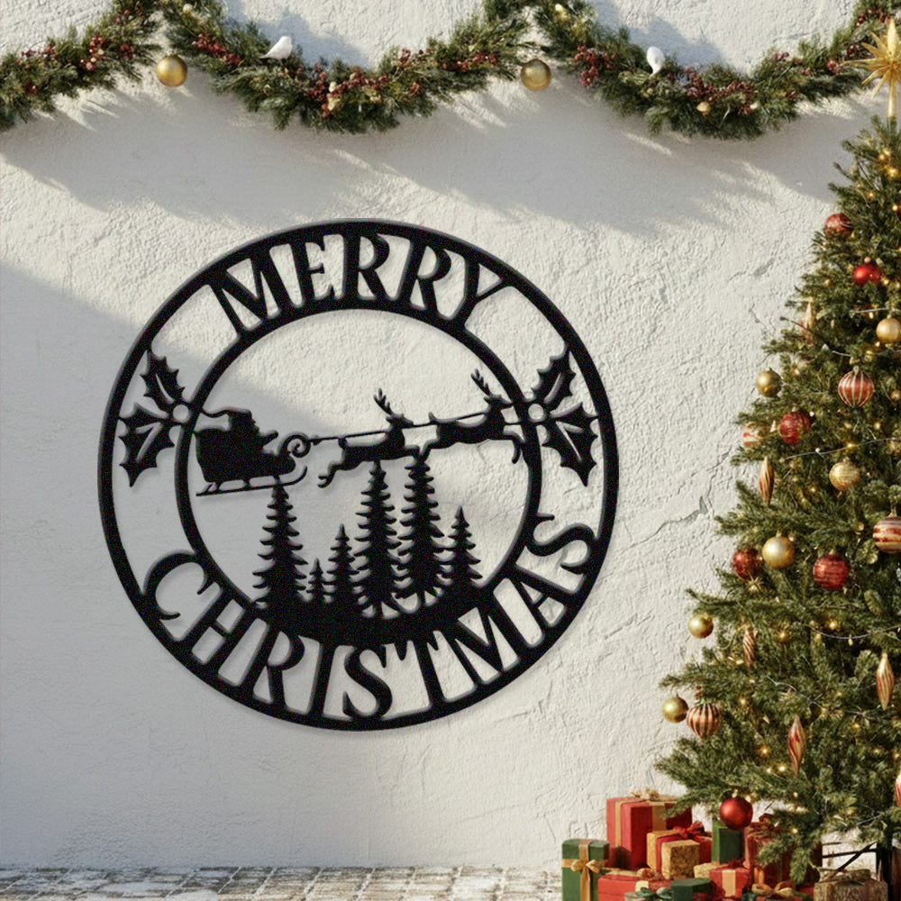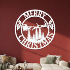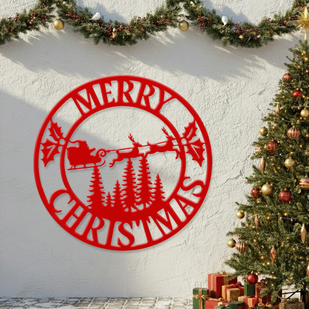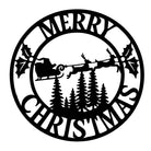 Merry Christmas Santa Sleigh Metal Wall Art – Round Holiday Metal Decor Sign