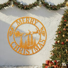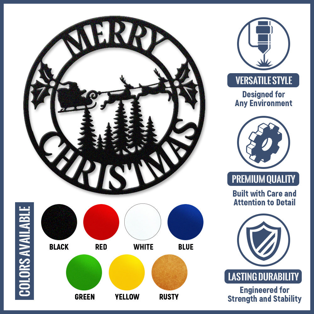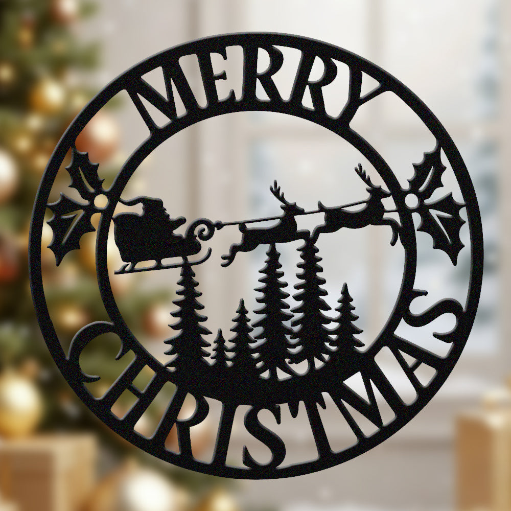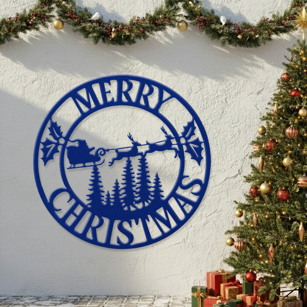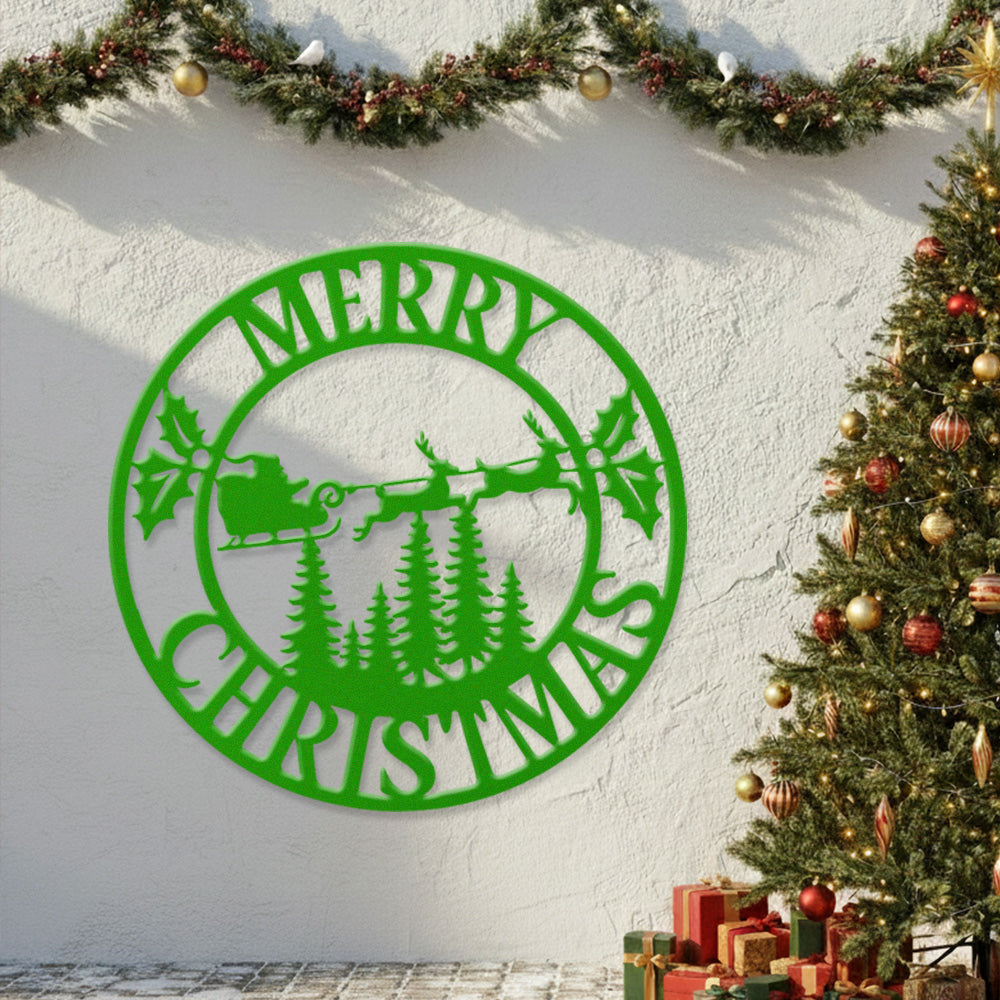 Merry Christmas Santa Sleigh Metal Wall Art – Round Holiday Metal Decor Sign