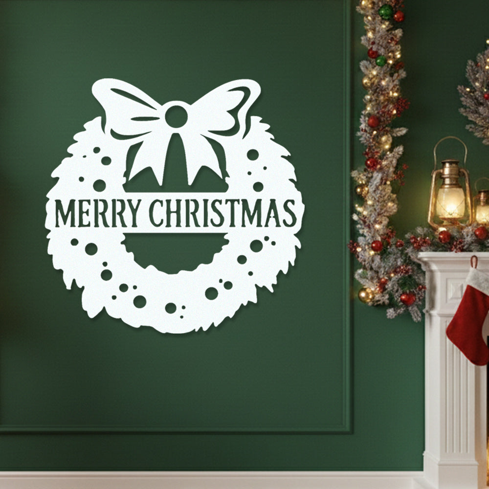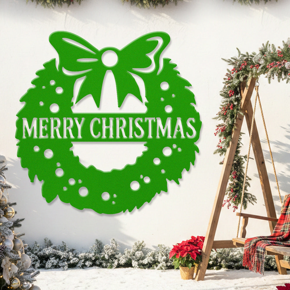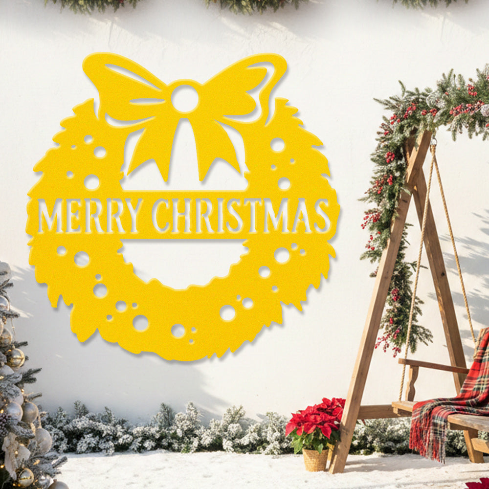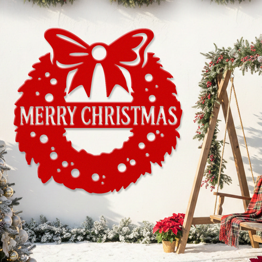 Merry Christmas Wreath Metal Wall Art – Holiday Bow Metal Decor Sign
