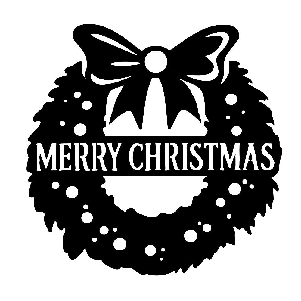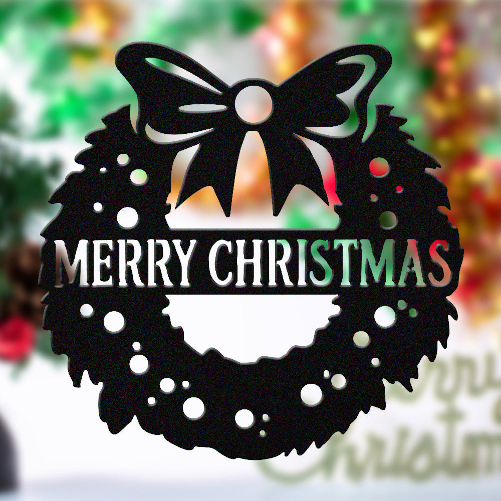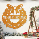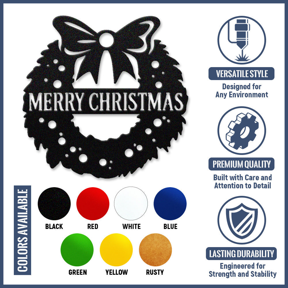 Merry Christmas Wreath Metal Wall Art – Holiday Bow Metal Decor Sign