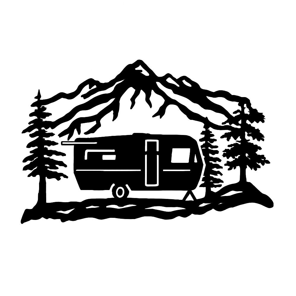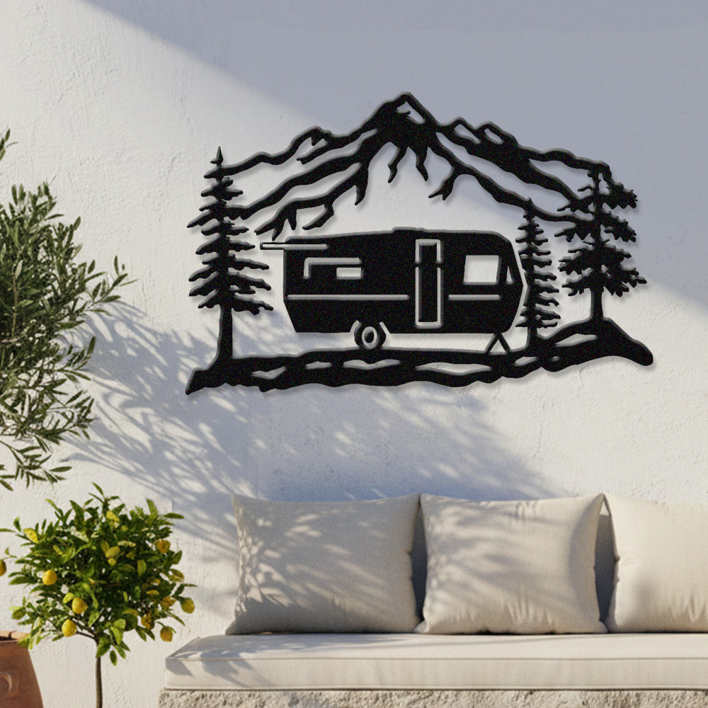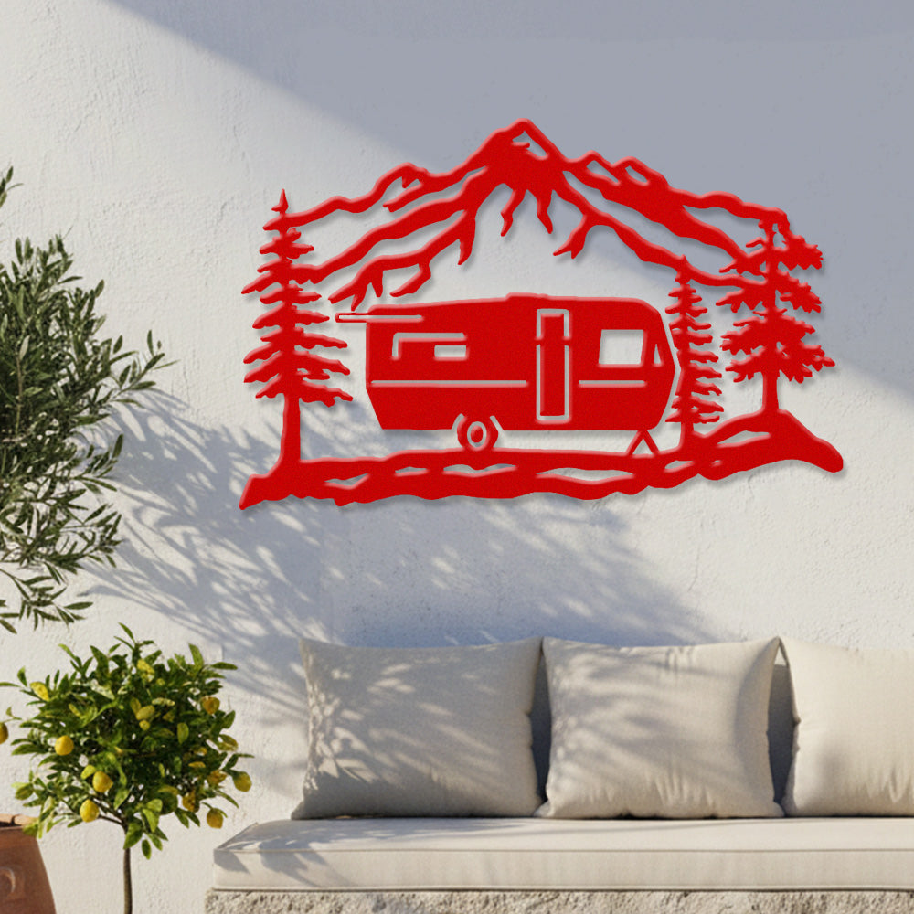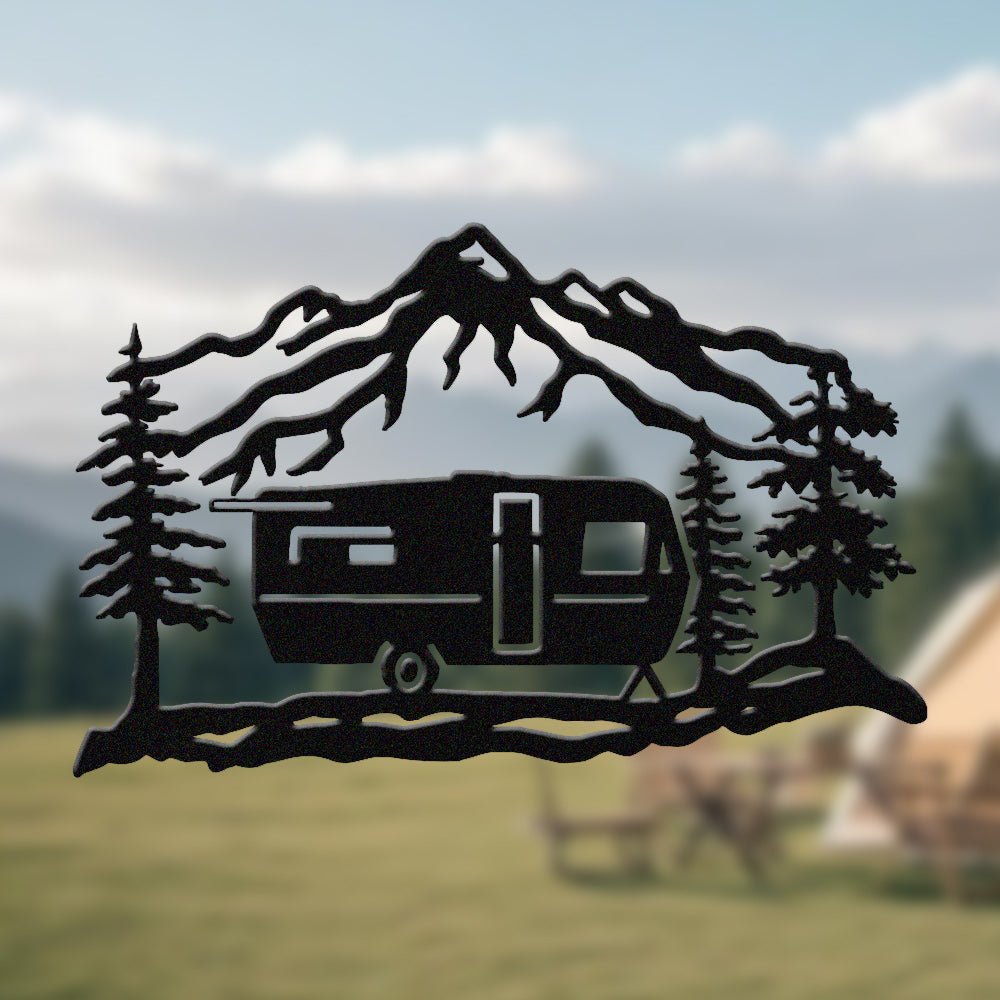 Mountain Camper Trailer Metal Wall Art – Rustic RV Camping Outdoor Decor