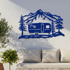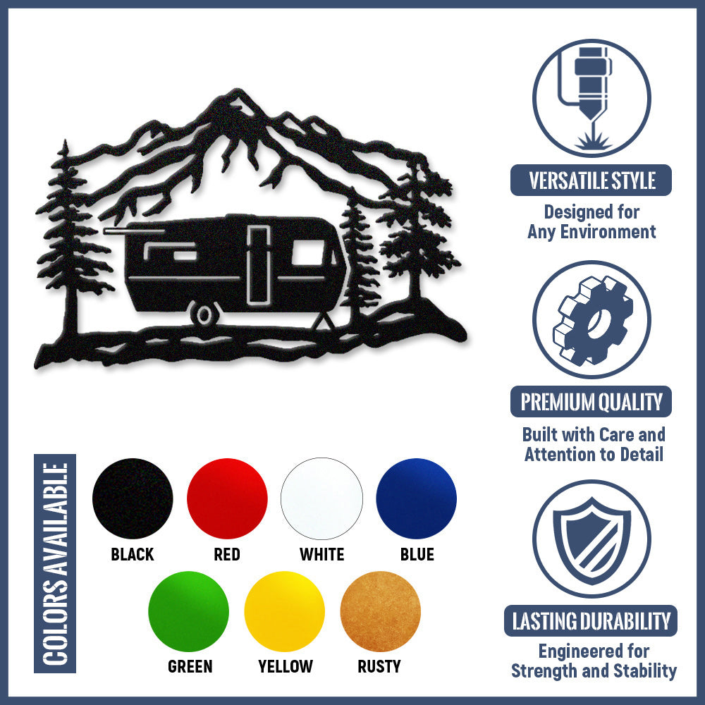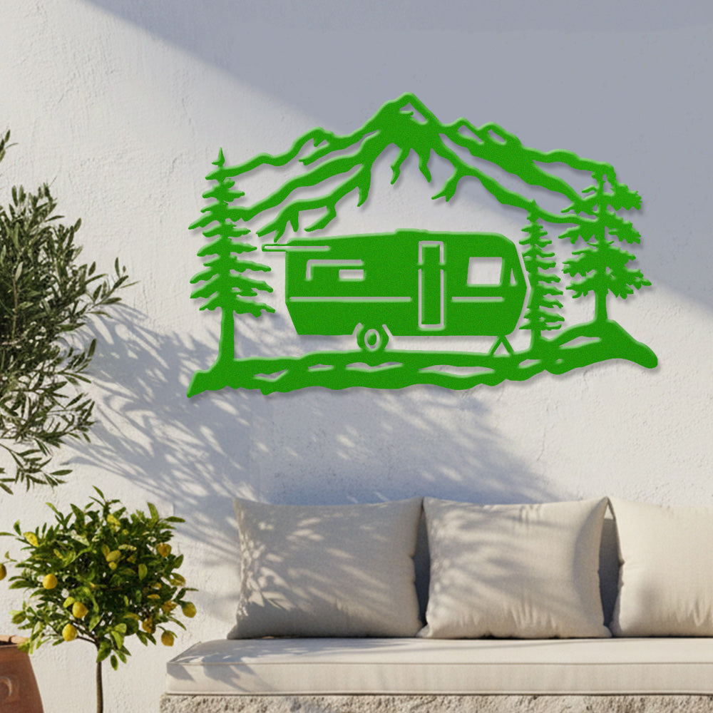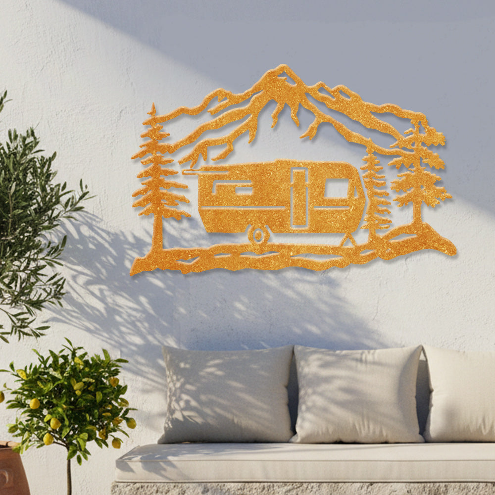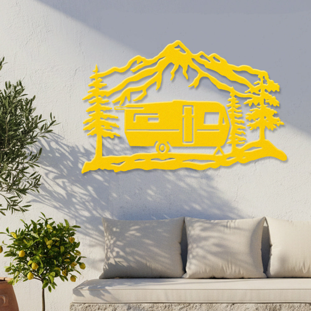Mountain Camper Trailer Metal Wall Art – Rustic RV Camping Outdoor Decor