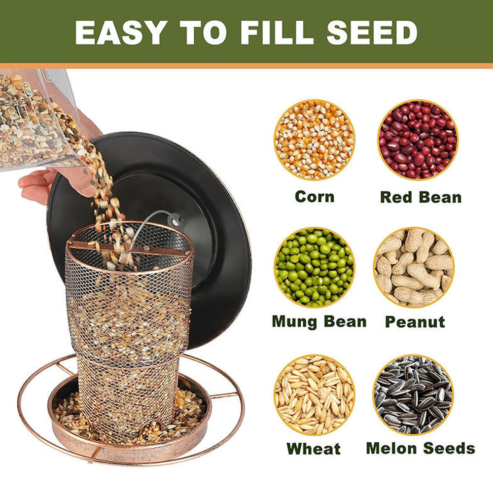 - 🌟 APPROPRIATE CAPACITY: This bird feeder could be filled wih a variety of seeds to attract birds, such as peanut, black oil sunflower seeds, safflower seeds to attract red finches, tits, house finches, birds, blue birds, warblers, starlings and more. When the seeds are eaten, more seeds will naturally fill the tray.