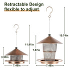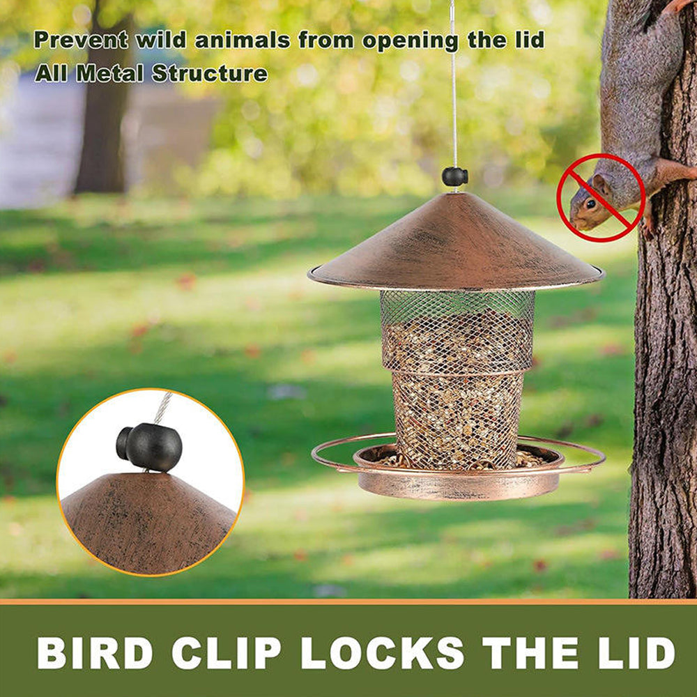 - 🐦 GAZEBO DESIGN: The bird feeder is made of high quality vintage metal material,won't break and fall, you can use it for a long time. The tray has leaking holes to avoid water accumulation and keep the food dry.
