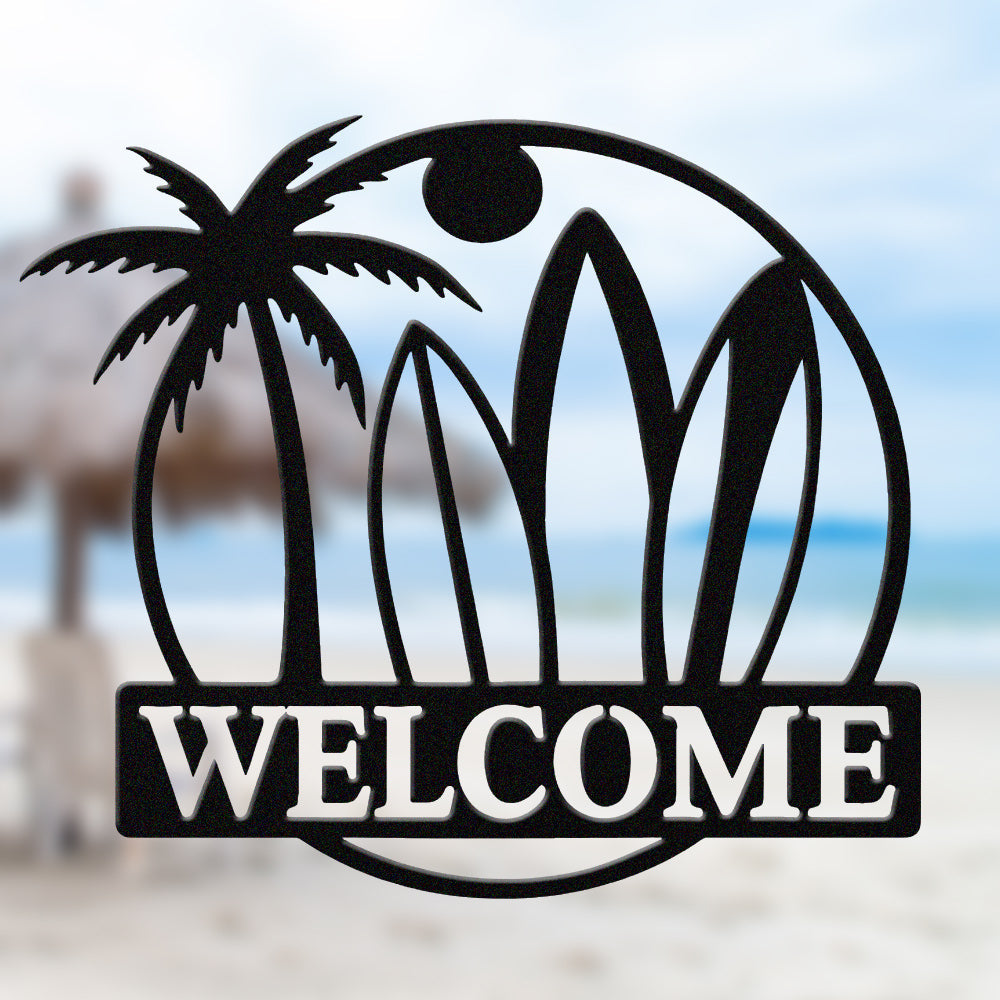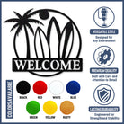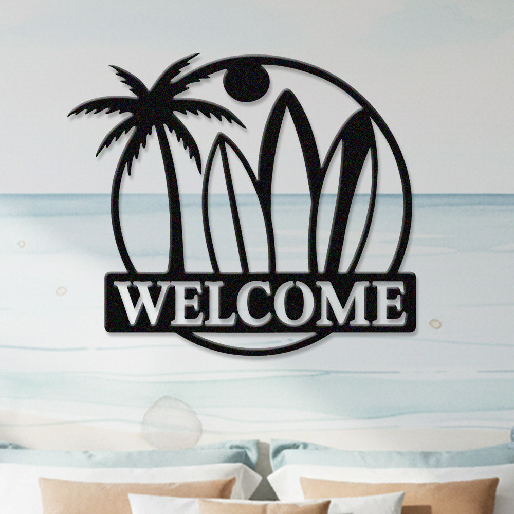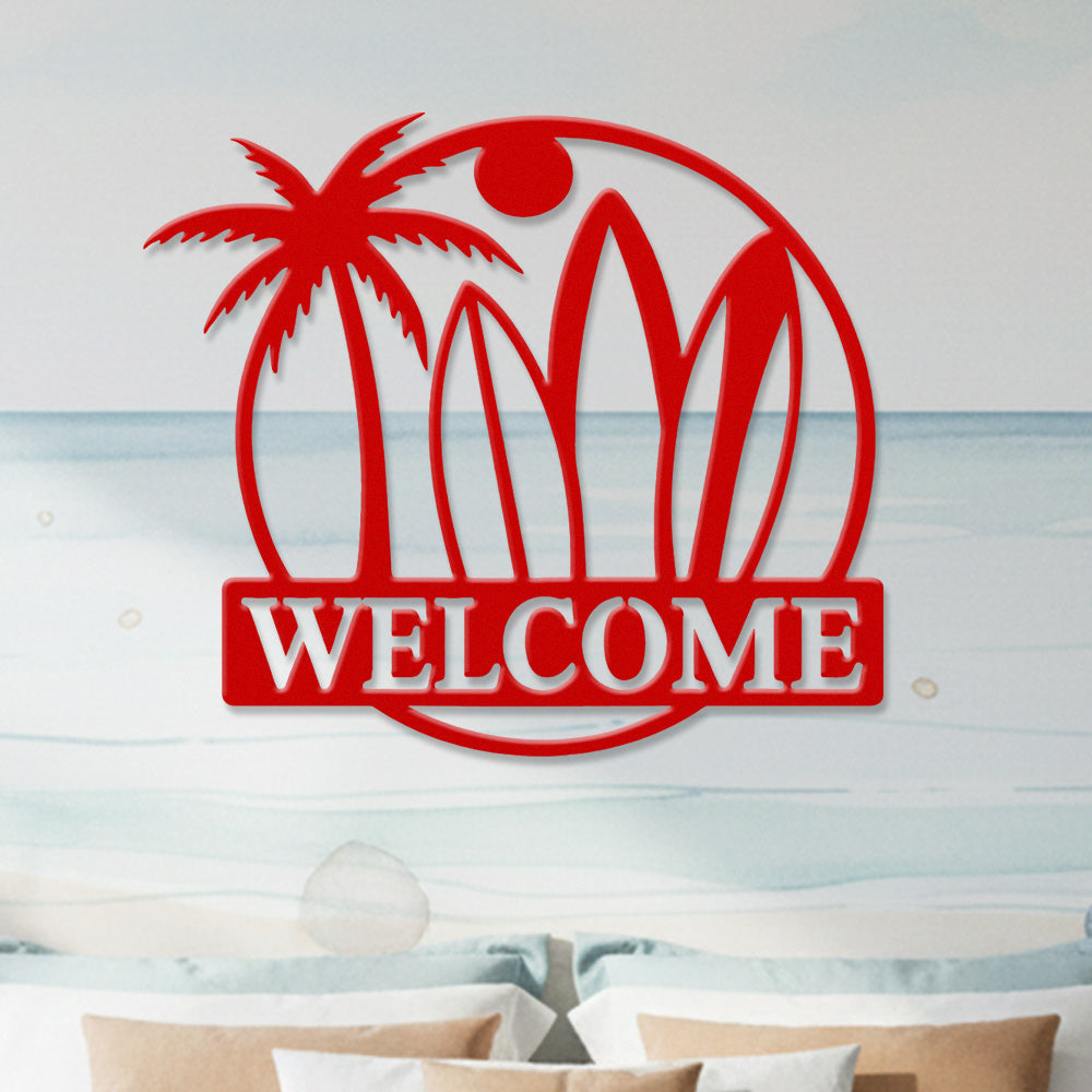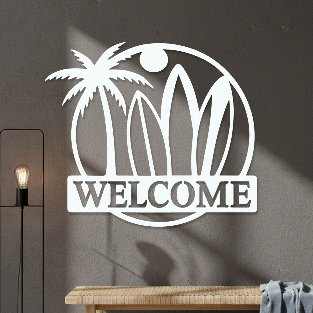 Surfboard Beach Welcome Metal Wall Art – Tropical Palm Iron Metal Door Sign