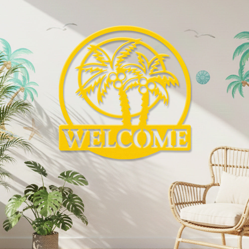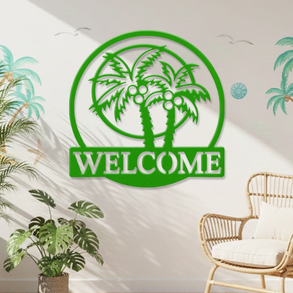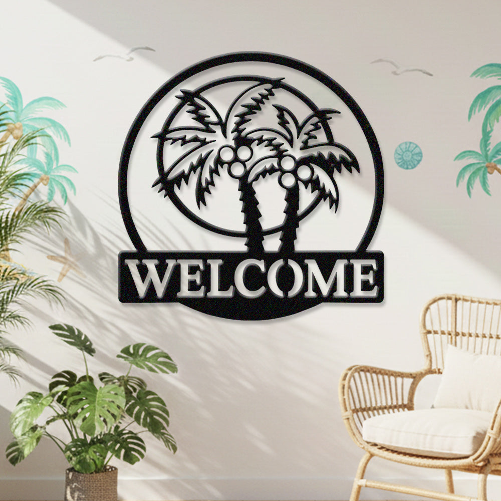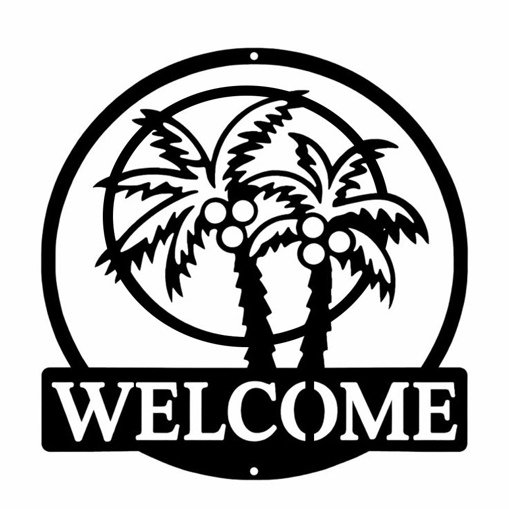 Tropical Palm Welcome Metal Wall Art – Round Coconut Tree Iron Metal Door Decor