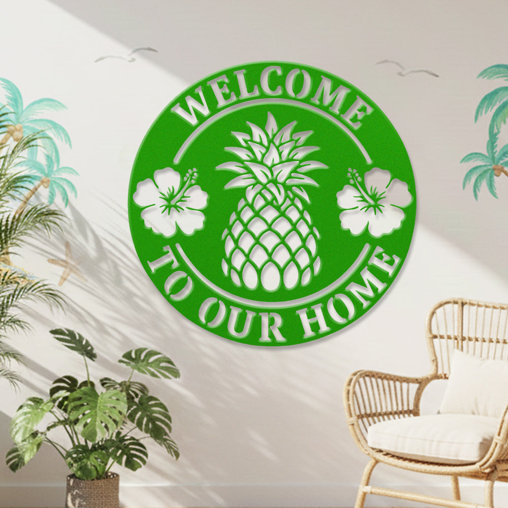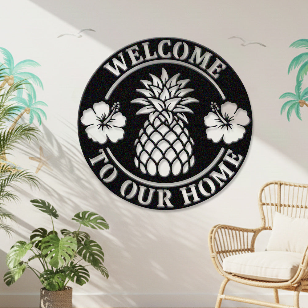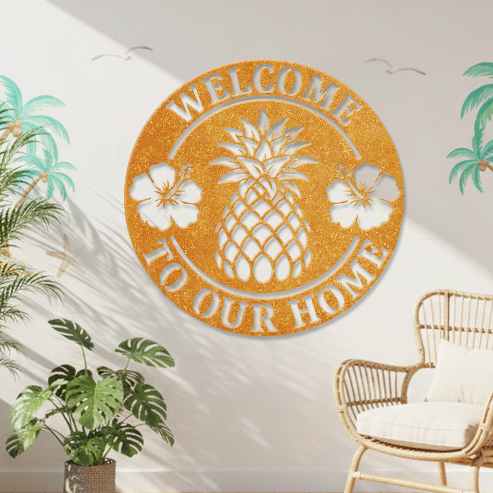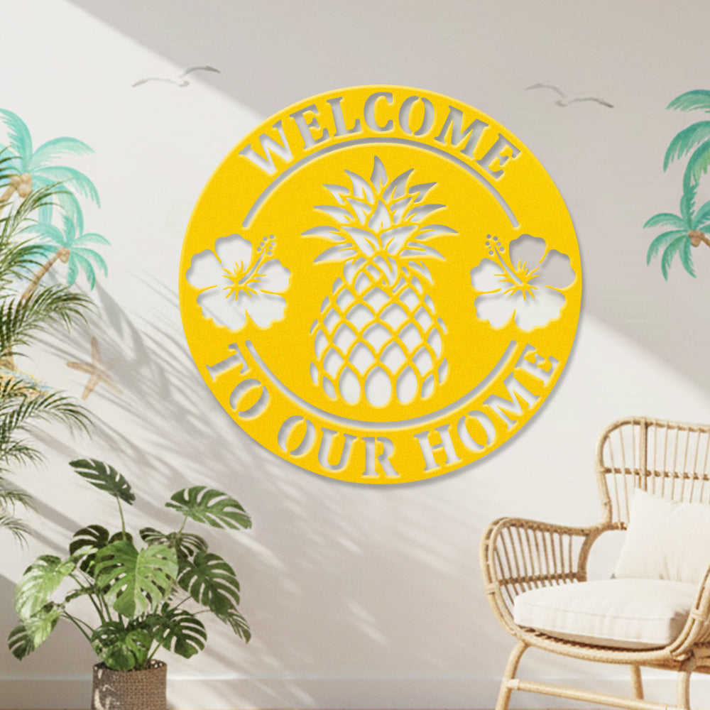 Tropical Pineapple Welcome Metal Wall Art – Round Iron Metal Home Door Sign