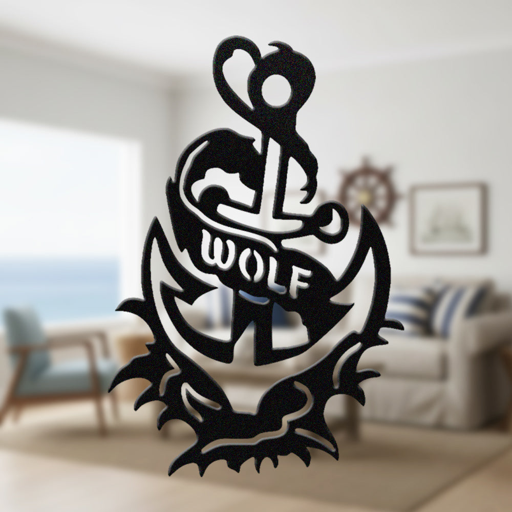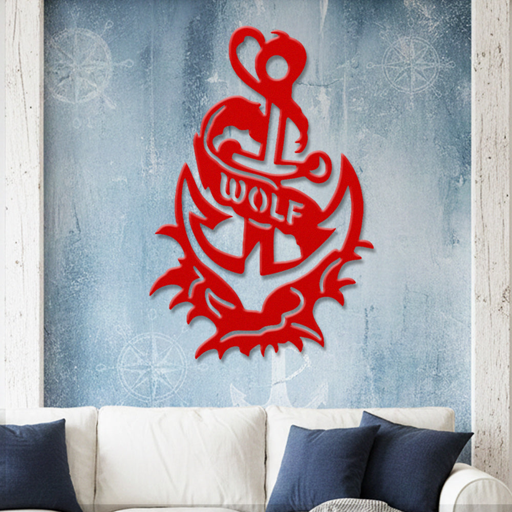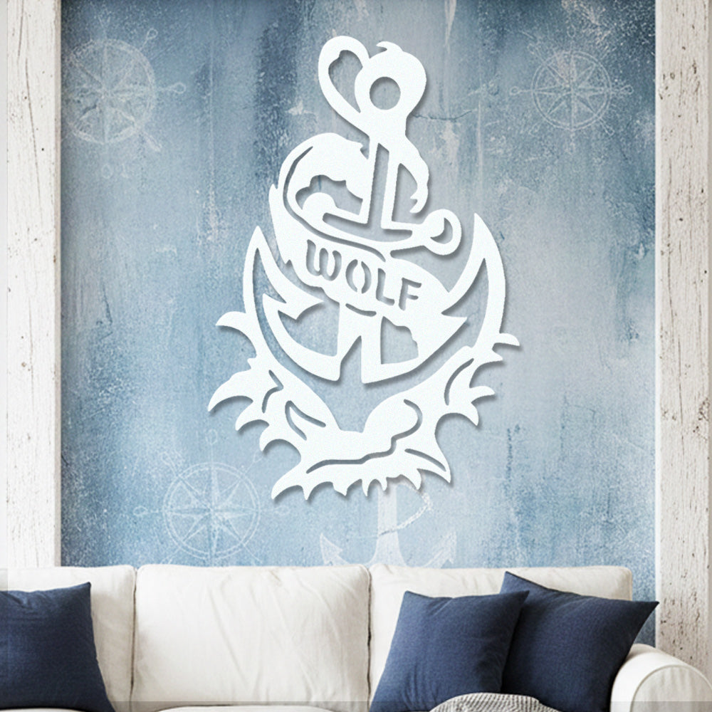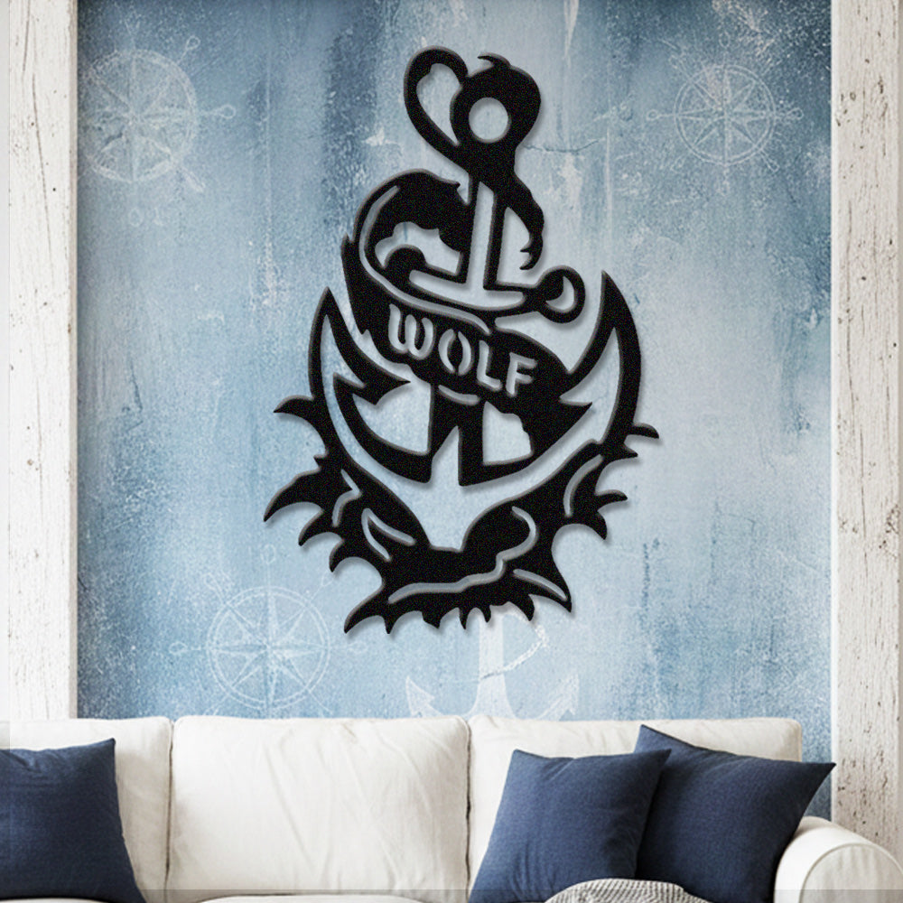 Wolf Metal Anchor Wall Art - Iron Sign with Rope and Flame Accents